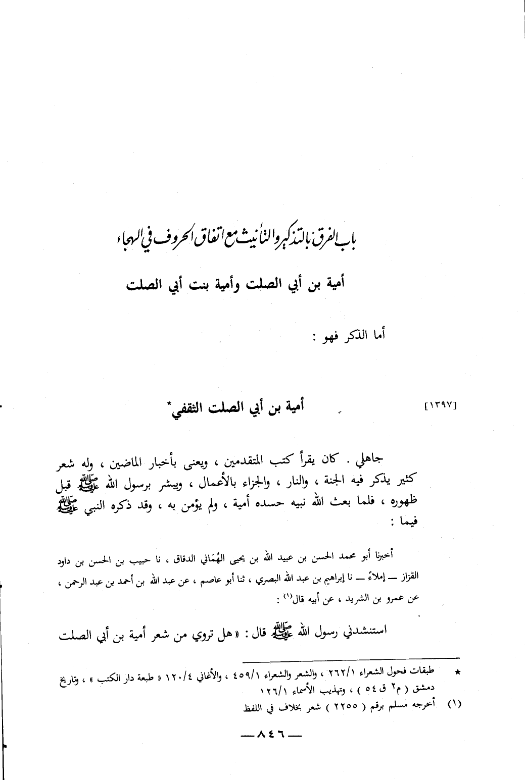 أَخْبَرَنَا أَبُو مُحَمَّدٍ الْحَسَنُ بْنُ عُبَيْدِ اللَّهِ بْنِ يَحْيَى الْهُمَانِيُّ الدَّقَّاقُ، نا حَبِيبُ بْنُ الْحَسَنِ بْنِ دَاوُدَ الْقَزَّازُ، إِمْلاءً، نا إِبْرَاهِيمُ بْنُ عَبْدِ اللَّهِ الْبَصْرِيُّ، ثنا أَبُو عَاصِمٍ، عَنْ عَبْدِ اللَّهِ بْنِ أَحْمَدَ بْنِ عَبْدِ الرَّحْمَنِ، عَنْ عَمْرِو بْنِ الشَّرِيدِ، عَنْ أَبِيهِ، قَالَ: اسْتَنْشَدَنِي رَسُولُ اللَّهِ صَلَّى اللَّهُ عَلَيْهِ وَسَلَّمَ قَالَ: «هَلْ تَرْوِي مِنْ شِعْرِ أُمَيَّةَ بْنِ أَبِي الصَّلْتِ