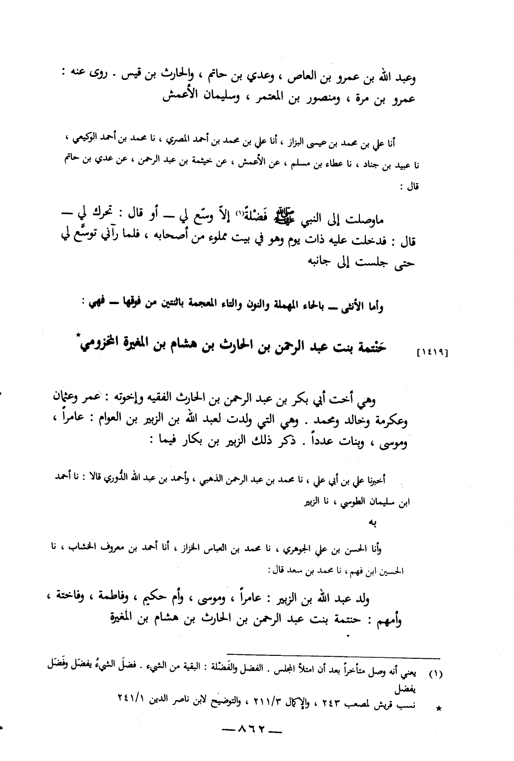 أَخْبَرَنَا عَلِيُّ بْنُ أَبِي عَلِيٍّ، نا مُحَمَّدُ بْنُ عَبْدِ الرَّحْمَنِ الذَّهَبِيُّ، وَأَحْمَدُ بْنُ عَبْدِ اللَّهِ الدُّورِيُّ، قَالا: نا أَحْمَدُ بْنُ سُلَيْمَانَ الطُّوسِيُّ، نا الزُّبَيْرُ، بِهِ، وَأَنَا الْحَسَنُ بْنُ عَلِيٍّ الْجَوْهَرِيُّ، نا مُحَمَّدُ بْنُ الْعَبَّاسِ الْخَزَّازُ، أَنَا أَحْمَدُ بْنُ مَعْرُوفٍ الْخَشَّابُ، نا الْحُسَيْنُ بْنُ فَهْمٍ، نا مُحَمَّدُ بْنُ سَعْدٍ، قَالَ: وَلَدَ عَبْدُ اللَّهِ بْنُ الزُّبَيْرِ: عَامِرًا، وَمُوسَى، وَأُمَّ حَكِيمٍ، وَفَاطِمَةَ، وَفَاخِتَةَ، وَأُمُّهُمْ: حَنْتَمَةُ بِنْتُ عَبْدِ الرَّحْمَنِ بْنِ الْحَارِثِ بْنِ هِشَامِ بْنِ الْمُغِيرَةِ