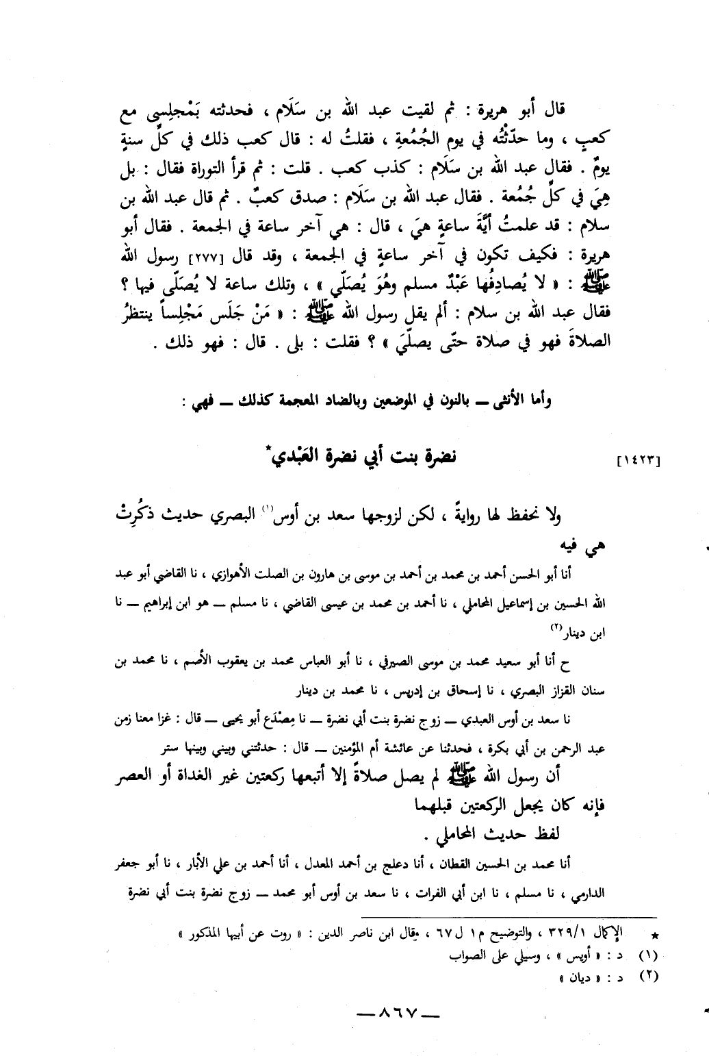 ثُمَّ قَالَ عَبْدُ اللَّهِ بْنُ سَلامٍ: قَدْ عَلِمْتُ أَيَّةَ سَاعَةٍ هِيَ، قَالَ: هِيَ آخِرُ سَاعَةٍ فِي الْجُمْعَةِ، فَقَالَ أَبُو هُرَيْرَةَ: كَيْفَ تَكُونُ فِي آخِرَ سَاعَةٍ فِي الْجُمْعَةِ، وَقَدْ قَالَ رَسُولُ اللَّهِ صَلَّى اللَّهُ عَلَيْهِ وَسَلَّمَ: «لا يُصَادِفُهَا عَبْدٌ مُسْلِمٌ وَهُوَ يُصَلِّي»، وَتِلْكَ سَاعَةٌ لا يُصَلَّى فِيهَا؟، فَقَالَ عَبْدُ اللَّهِ بْنُ سَلامٍ: أَلَمْ يَقُلْ رَسُولُ اللَّهِ صَلَّى اللَّهُ عَلَيْهِ وَسَلَّمَ: «مَنْ جَلَسَ مَجْلِسًا يَنْتَظِرُ الصَّلاةَ فَهُوَ فِي صَلاةٍ حَتَّى يُصَلِّيَ»؟ فَقُلْتُ: بَلَى، قَالَ: فَهُوَ ذَلِكَ