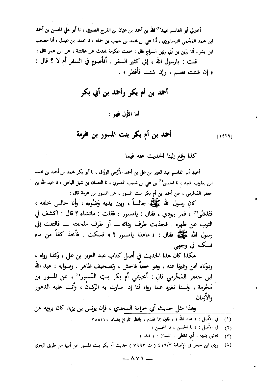 كَذَا وَقَعَ إِلَيْنَا الْحَدِيثُ عَنْهُ فِيمَا أَخْبَرَنَا أَبُو الْقَاسِمِ عَبْدُ الْعَزِيزِ بْنُ عَلِيِّ بْنِ أَحْمَدَ الأَزْجِيُّ الْوَرَّاقُ، نا أَبُو بَكْرٍ مُحَمَّدُ بْنُ أَحْمَدَ بْنِ مُحَمَّدِ بْنِ يَعْقُوبَ الْمُفِيدُ، نا الْحَسَنُ بْنُ عَلِيِّ بْنِ شَبِيبٍ الْمَعْمَرِيُّ، نا النُّعْمَانُ بْنُ شِبْلٍ الْبَاهِلِيُّ، نا عَبْدُ اللَّهِ بْنُ جَعْفَرٍ الْمَخْرَمِيُّ، عَنْ أَحْمَدَ بْنِ أُمِّ بَكْرٍ بِنْتِ الْمِسْوَرِ بْنِ مَخْرَمَةَ، قَالَ: كَانَ رَسُولُ اللَّهِ صَلَّى اللَّهُ عَلَيْهِ وَسَلَّمَ جَالِسًا، وَبَيْنَ يَدَيْهِ وَضُوءَهُ، وَأَنَا جَالِسٌ خَلْفَهُ، فَتَغَشَّى، فَمَرَّ يَهُودِيٌّ، فَقَالَ: «يَا مِسْوَرُ»، فَقُلْتُ: مَا تَشَاءُ؟، قَالَ: " اكْشِفْ لِي الثَّوْبَ عَنْ ظَهْرِهِ، فَجَذَبْتُ طَرْفَ رِدَائِهِ أَوْ طَرْفَ مِلْحَفَتِهِ، فَالْتَفَتَ إِلَيَّ رَسُولُ اللَّهِ صَلَّى اللَّهُ عَلَيْهِ وَسَلَّمَ، فَقَالَ: «مَا هَذَا يَا مِسْوَرُ»؟ فَسَكَتُّ، «فَأَخَذَ كَفًّا مِنْ مَاءٍ فَسَكَبَهُ فِي وَجْهِي»، هَكَذَا كَانَ الْحَدِيثُ فِي أَصْلِ كِتَابِ عَبْدِ الْعَزِيزِ بْنِ عَلِيٍّ، وَكَذَا رَوَاهُ وَدَوَّنَّاهُ نَحْنُ وَغَيْرُنَا، وَهُوَ خَطَأٌ فَاحِشٌ، وَتَصْحِيفٌ ظَاهِرٌ، وَصَوَابُهُ: عَبْدُ اللَّهِ بْنُ جَعْفَرٍ الْمَخْرَمِيُّ، قَالَ أَخْبَرَتْنِي أُمُّ بَكْرٍ بِنْتُ الْمِسْوَرِ، عَنِ الْمِسْوَرِ بْنِ مَخْرَمَةَ، وَلَسْنَا نُغَيِّرُهُ عَمَّا رَوَاهُ لَنَا إِذَا سَارَتْ بِهِ الرُّكْبَانُ، وَأَتَتْ عَلَيْهِ الدُّهُورُ وَالأَزْمَانُ، وَهَذَا مِثْلُ حَدِيثِ أَبِي خُزَامَةَ السَّعْدِيِّ، فَإِنَّ يُونُسَ بْنَ يَزِيدَ كَانَ يَرْوِيهِ عَنِ