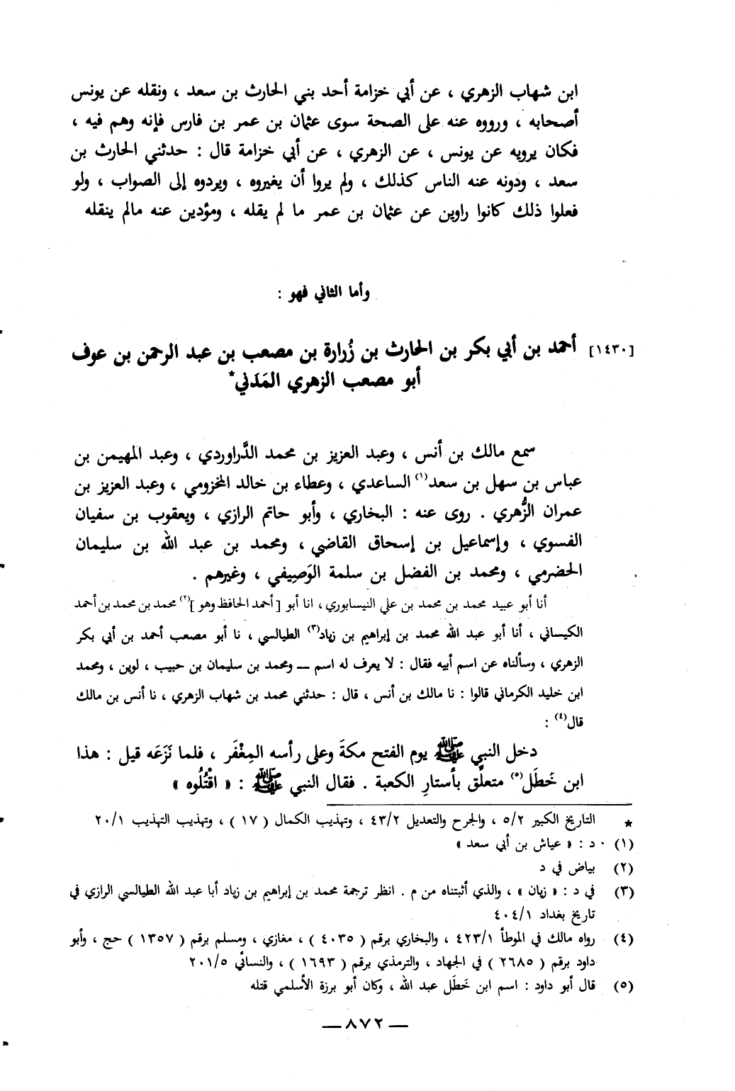 أَنَا أَبُو عُبَيْدِ اللَّهِ مُحَمَّدُ بْنُ مُحَمَّدِ بْنِ عَلِيٍّ النَّيْسَابُورِيُّ، أَنَا أَبُو أَحْمَدَ الْحَافِظُ وَهُوَ مُحَمَّدُ بْنُ أَحْمَدَ الْكَيْسَانِيُّ، أَنَا أَبُو عَبْدِ اللَّهِ مُحَمَّدُ بْنُ إِبْرَاهِيمَ بْنِ زِيَادٍ الطَّيَالِسِيُّ، نا أَبُو مُصْعَبٍ أَحْمَدُ بْنُ أَبِي بَكْرٍ الزُّهْرِيُّ، وَسَأَلْنَاهُ عَنِ اسْمِ أَبِيهِ فَقَالَ: لا يُعْرَفُ لَهُ اسْمٌ، وَمُحَمَّدُ بْنُ سُلَيْمَانَ بْنِ حَبِيبٍ لُوَيْنُ، وَمُحَمَّدُ بْنُ خُلَيْدٍ الْكِرْمَانِيُّ، قَالُوا: نا مَالِكُ بْنُ أَنَسٍ، قَالَ: حَدَّثَنِي مُحَمَّدُ بْنُ شِهَابٍ الزُّهْرِيُّ، نا أَنَسُ بْنُ مَالِكٍ، قَالَ: دَخَلَ النَّبِيُّ صَلَّى اللَّهُ عَلَيْهِ وَسَلَّمَ يَوْمَ الْفَتْحِ مَكَّةَ وَعَلَى رَأْسِهِ الْمِغْفَرُ، فَلَمَّا نَزَعَهُ، قِيلَ: هَذَا ابْنُ خَطَلٍ مُتَعَلِّقٌ بِأَسْتَارِ الْكَعْبَةِ، فَقَالَ النَّبِيُّ صَلَّى اللَّهُ عَلَيْهِ وَسَلَّمَ: «اقْتُلُوهُ»،