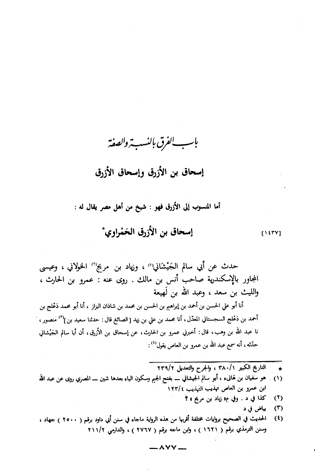 أَنَا أَبُو عَلِيٍّ الْحَسَنُ بْنُ أَحْمَدَ بْنِ إِبْرَاهِيمَ بْنِ الْحَسَنِ بْنِ مُحَمَّدِ بْنِ شَاذَانَ الْبَزَّازُ، أَنَا أَبُو مُحَمَّدٍ دَعْلَجُ بْنُ أَحْمَدَ بْنِ دَعْلَجٍ السِّجِسْتَانِيُّ الْمُعَدَّلُ، أَنَا مُحَمَّدُ بْنُ عَلِيِّ بْنِ زَيْدٍ الصَّائِغُ، قَالَ: حَدَّثَنَا سَعِيدُ بْنُ مَنْصُورٍ، نا عَبْدُ اللَّهِ بْنُ وَهْبٍ، قَالَ: أَخْبَرَنِي عَمْرُو بْنُ الْحَارِثِ، عَنْ إِسْحَاقَ بْنِ الأَزْرَقِ، أَنَّ أَبَا سَالِمٍ الْجَيْشَانِيُّ حَدَّثَهُ، أَنَّهُ سَمِعَ عَبْدَ اللَّهِ بْنَ عَمْرِو بْنِ الْعَاصِ، يَقُولُ: