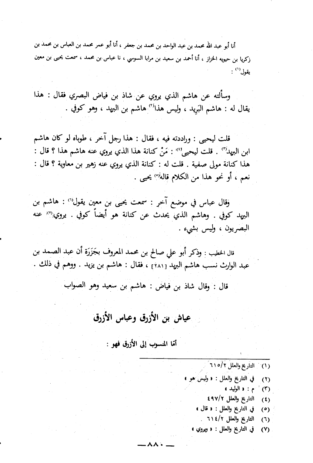 أَنَا أَبُو عَبْدِ اللَّهِ مُحَمَّدُ بْنُ عَبْدِ الْوَاحِدِ بْنِ مُحَمَّدِ بْنِ جَعْفَرٍ، أَنَا أَبُو عُمَرَ مُحَمَّدُ بْنُ الْعَبَّاسِ بْنِ مُحَمَّدِ بْنِ زَكَرِيَّا بْنِ حَيُّوَيْهِ الْخَزَّازُ، أَنَا أَحْمَدُ بْنُ سَعِيدِ بْنِ مرابا السُّوسِيُّ، نا عَبَّاسُ بْنُ مُحَمَّدٍ، سَمِعْتُ يَحْيَى بْنَ مَعِينٍ، يَقُولُ: وَسَأَلْتُهُ عَنْ هَاشِمٍ الَّذِي يَرْوِي عَنْ شَاذِّ بْنِ فَيَّاضٍ الْبَصْرِيِّ، فَقَالَ: هَذَا يُقَالُ لَهُ: هَاشِمُ الْبَرِيدِ، وَلَيْسَ هَذَا هَاشِمُ بْنُ الْبَرِيدِ، وَهُوَ كُوفِيٌّ، قُلْتُ لِيَحْيَى: وَرَادَدْتُهُ فِيهِ، فَقَالَ: هَذَا رَجُلٌ آخَرُ، طُوبَاهُ لَوْ كَانَ هَاشِمَ بْنَ الْبَرِيدِ، قُلْتُ لِيَحْيَى: مَنْ كِنَانَةُ هَذَا الَّذِي يَرْوِي عَنْهُ هَاشِمٌ هَذَا، قَالَ: هَذَا كِنَانَةُ مَوْلَى صَفِيَّةَ، قُلْتُ لَهُ: كِنَانَةُ الَّذِي يَرْوِي عَنْ زُهَيْرِ بْنِ مُعَاوِيَةَ؟، قَالَ: نَعَمْ، أَوْ نَحْوَ هَذَا مِنَ الْكَلامِ قَالَهُ يَحْيَى، وَقَالَ عَبَّاسٌ فِي مَوْضِعٍ آخَرَ سَمِعْتُ يَحْيَى بْنَ مَعِينٍ، يَقُولُ: هَاشِمُ بْنُ الْبَرِيدِ كُوفِيٌّ، وَهَاشِمٌ الَّذِي يُحَدِّثُ عَنْهُ كِنَانَةُ هُوَ أَيْضًا كُوفِيٌّ، يَرْوِي عَنْهُ الْبَصْرِيُّونَ، وَلَيْسَ بِشَيْءٍ، قَالَ الْخَطِيبُ: وَذَكَرَ أَبُو عَلِيٍّ صَالِحُ بْنُ مُحَمَّدٍ الْمَعْرُوفُ بَجَزَرَةَ أَنَّ عَبْدَ الصَّمَدِ بْنِ عَبْدِ الْوَارِثِ نَسَبَ هَاشِمَ الْبَرِيدِ، فَقَالَ: هَاشِمُ بْنُ يَزِيدَ، وَوَهِمَ فِي ذَلِكَ، قَالَ وَقَالَ شَاذُ بْنُ فَيَّاضٍ: هَاشِمُ بْنُ سَعِيدٍ وَهُوَ الصَّوَابُ.