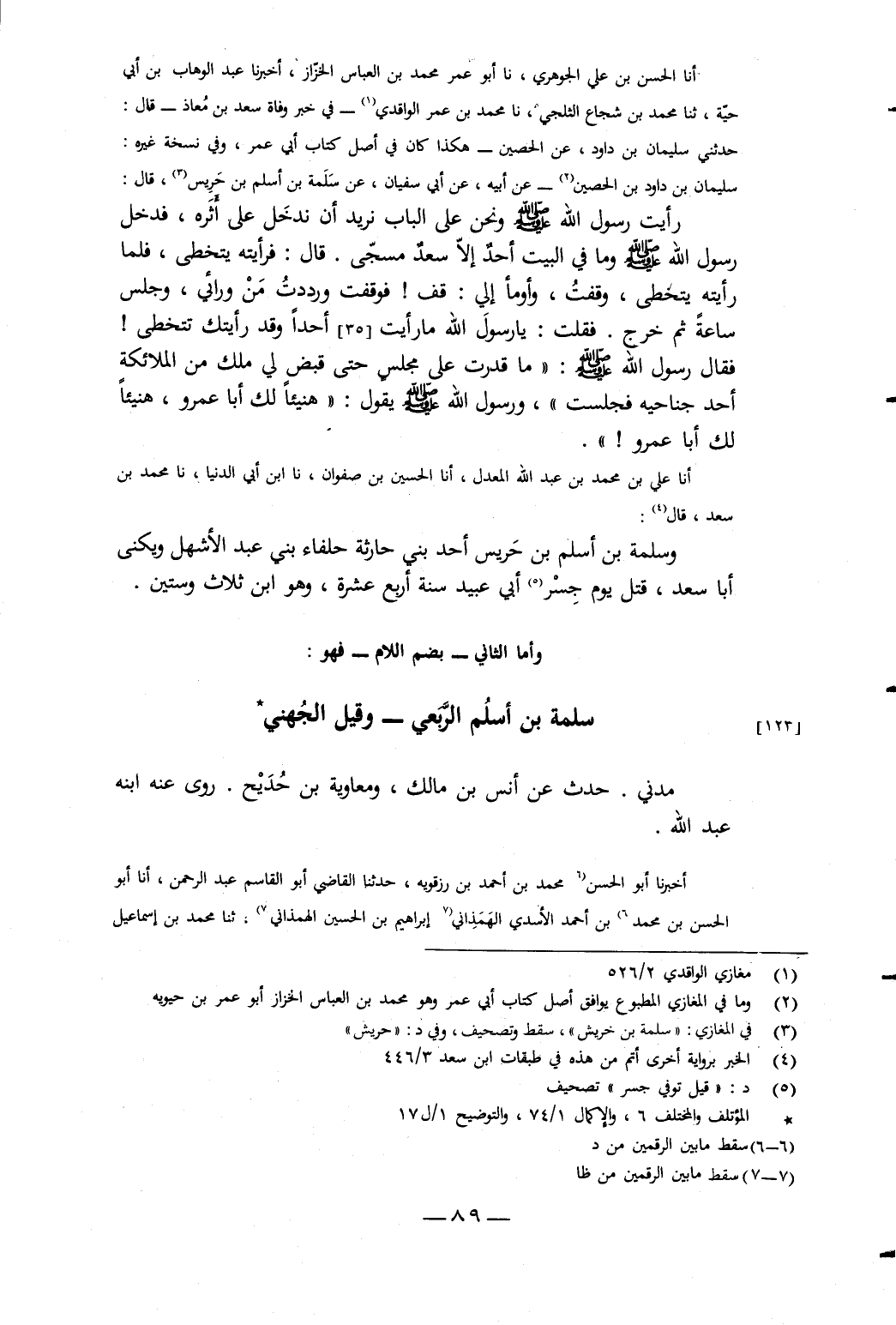 أَنَا عَلِيُّ بْنُ مُحَمَّدِ بْنِ عَبْدِ اللَّهِ الْمُعَدِّلُ، أَنَا الْحُسَيْنُ بْنُ صَفْوَانَ، نَا ابْنُ أَبِي الدُّنْيَا، نَا مُحَمَّدُ بْنُ سَعْدٍ، قَالَ: وَسَلَمَةُ بْنُ أَسْلَمَ بْنِ حَرِيسٍ أَحَدُ بَنِي حَارِثَةَ حُلَفَاءِ بَنِي عَبْدِ الأَشْهَلِ وَيُكَنَّى أَبَا سَعْدٍ، قُتِلَ يَوْمَ جِسْرِ أَبِي عُبَيْدٍ سَنَةَ أَرْبَعِ عَشْرَةَ، وَهُوَ ابْنُ ثَلاثٍ وَسِتِّينَ وَأَمَّا الثَّانِي - بِضَمِّ اللامِ - فَهُوَ: