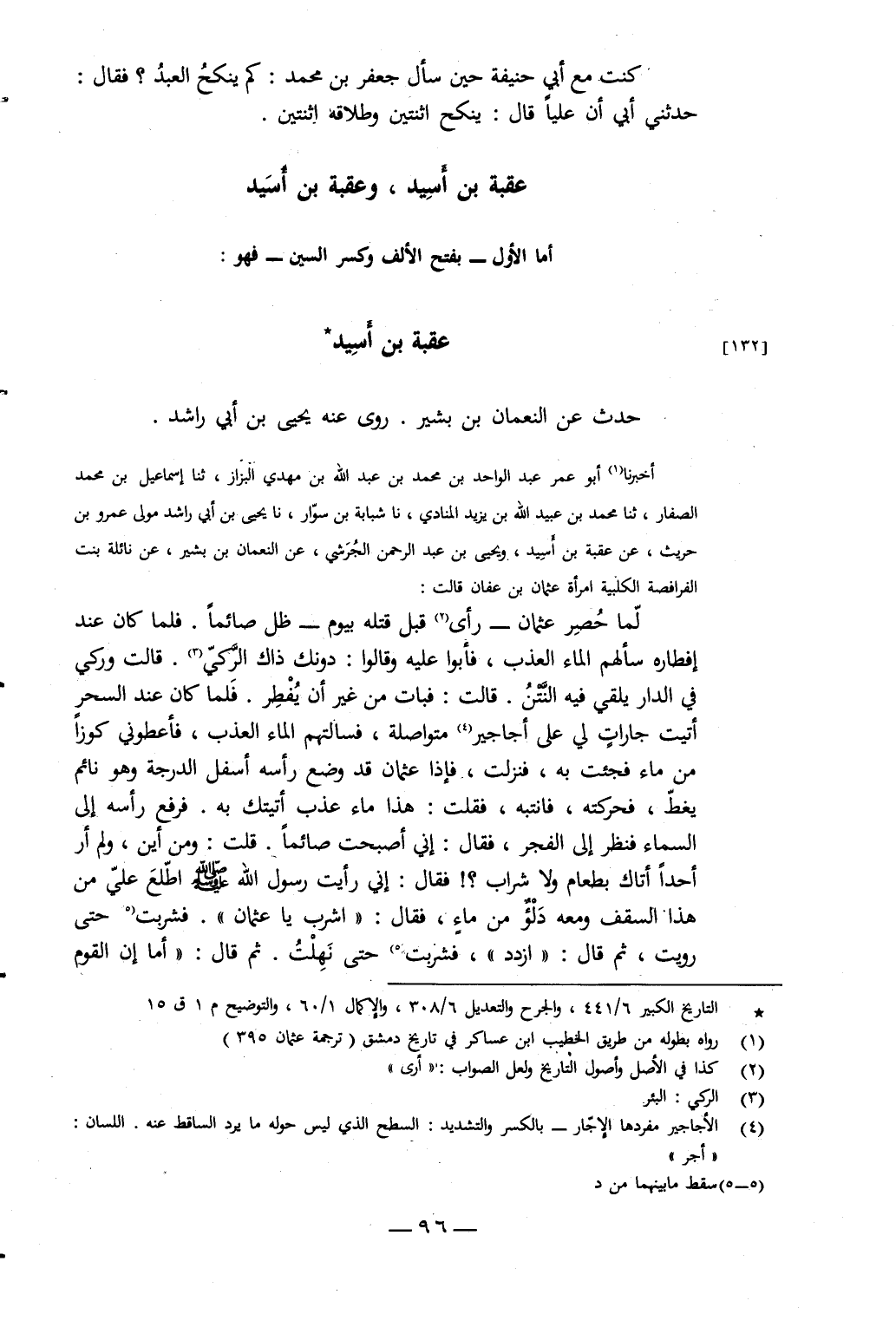 أَخْبَرَنَا أَبُو عُمَرَ عَبْدُ الْوَاحِدِ بْنُ مُحَمَّدِ بْنِ عَبْدِ اللَّهِ بْنِ مَهْدِيٍّ الْبَزَّازُ، ثَنَا إِسْمَاعِيلُ بْنُ مُحَمَّدٍ الصَّفَّارُ، ثَنَا مُحَمَّدُ بْنُ عُبَيْدِ اللَّهِ بْنِ يَزِيدَ الْمُنَادِي، نَا شَبَابَةُ بْنُ سَوَّارٍ، نَا يَحْيَى بْنُ أَبِي رَاشِدٍ مَوْلَى عَمْرِو بْنِ حُرَيْثٍ، عَنْ عَقْبَةَ بْنِ أَسِيدٍ، وَيَحْيَى بْنِ عَبْدِ الرَّحْمَنِ الْجُرَشِيِّ، عَنِ النُّعْمَانِ بْنِ بَشِيرٍ، عَنْ نَائِلَةَ بِنْتِ الْفَرَافِصَةِ الْكَلْبِيَّةِ امْرَأَةِ عُثْمَانَ بْنِ عَفَّانَ، قَالَتْ: لَمَّا حُصِرَ عُثْمَانُ، رَأَى قَبْلَ قَتْلِهِ بِيَوْمٍ، ظَلَّ صَائِمًا، فَلَمَّا كَانَ عِنْدَ إِفْطَارِهِ سَأَلَهُمُ الْمَاءَ الْعَذْبَ، فَأَبَوْا عَلَيْهِ، وَقَالُوا: دُونَكَ ذَاكَ الرَّكِيُّ، قَالَتْ: وَرَكِيٌّ فِي الدَّارِ يُلْقَى فِيهِ النَّتَنُ، قَالَتْ: فَبَاتَ مِنْ غَيْرِ أَنْ يُفْطِرَ، فَلَمَّا كَانَ عِنْدَ السَّحَرِ أَتَيْتُ جَارَاتٍ لِي عَلَى أَجَاجِيرَ مُتَوَاصِلَةٍ، فَسَأَلْتُهُمُ الْمَاءَ الْعَذْبَ، فَأَعْطُونِي كُوزًا مِنْ مَاءٍ، فَجِئْتُ بِهِ، فَنَزَلْتُ، فَإِذَا عُثْمَانُ قَدْ وَضَعَ رَأْسَهُ أَسْفَلَ الدَّرَجَةِ وَهُوَ نَائِمٌ يَغُطُّ، فَحَرَّكْتُهُ، فَانْتَبَهَ، فَقُلْتُ: هَذَا مَاءٌ عَذْبٌ أَتَيْتُكَ بِهِ، فَرَفَعَ رَأْسَهُ إِلَى السَّمَاءِ، فَنَظَرَ إِلَى الْفَجْرِ، فَقَالَ: إِنِّي أَصْبَحْتُ صَائِمًا، قُلْتُ: وَمِنْ أَيْنَ، وَلَمْ أَرَ أَحَدًا أَتَاكَ بِطَعَامٍ وَلا شَرَابٍ؟! فَقَالَ: إِنِّي رَأَيْتُ رَسُولَ اللَّهِ صَلَّى اللَّهُ عَلَيْهِ وَسَلَّمَ اطَّلَعَ عَلَيَّ مِنْ هَذَا السَّقْفِ وَمَعَهُ دَلْوٌ مِنْ مَاءٍ، فَقَالَ: «اشْرَبْ يَا عُثْمَانُ»، فَشَرِبْتُ حَتَّى رُوِيتُ، ثُمَّ قَالَ: «ازْدَدْ»، فَشَرِبْتُ حَتَّى نَهِلْتُ، ثُمَّ قَالَ: "