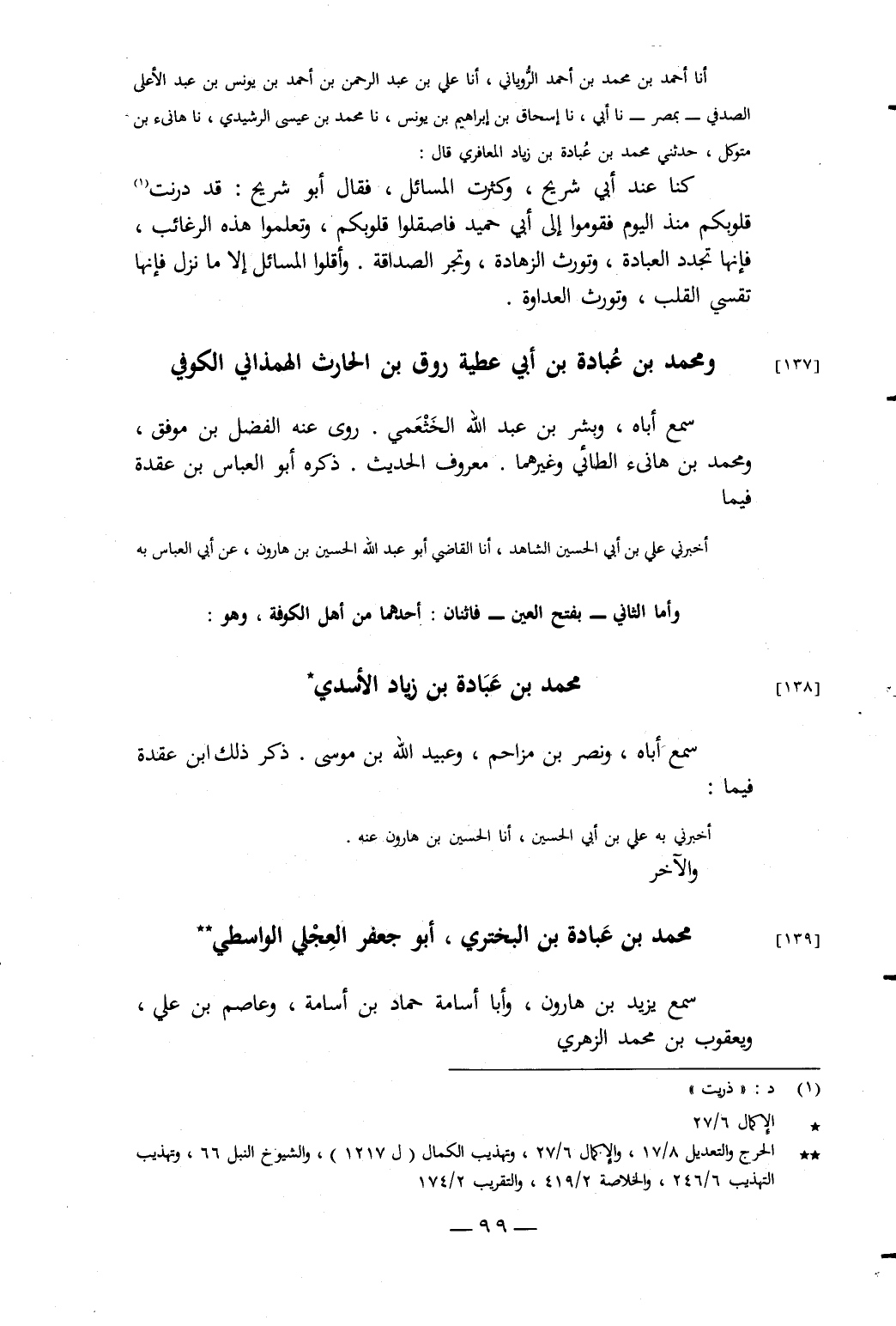 وَمُحَمَّدُ بْنُ عُبَادَةَ بْنِ أَبِي عَطِيَّةَ رَوْقِ بْنِ الْحَارِثِ الْهَمَذَانِيُّ الْكُوفِيُّ
