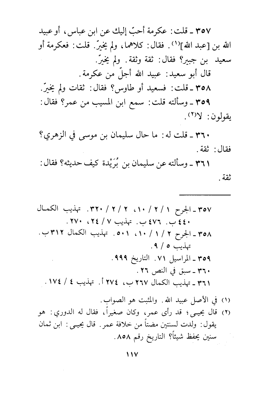 357 - قلت عِكْرِمَة أحب إِلَيْك عَن بن عَبَّاس أَو عبيد الله بن عبد الله فَقَالَ كِلَاهُمَا وَلم يُخَيّر قلت فعكرمة أَو سعيد بن جُبَير فَقَالَ ثِقَة وثقة وَلم يُخَيّر قَالَ أَبُو سعيد عبيد الله أجل من عِكْرِمَة