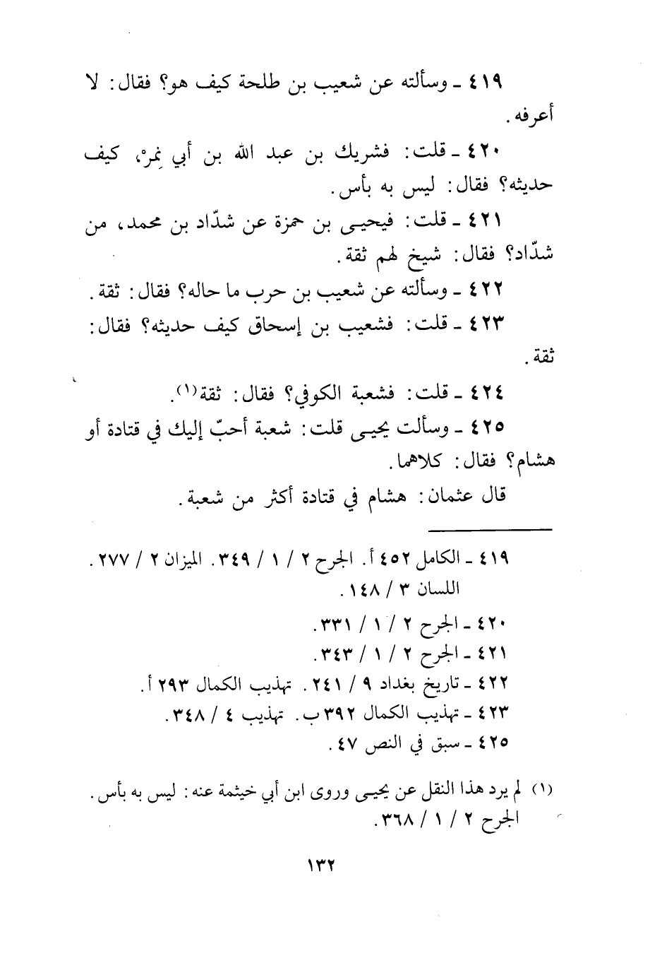 425 - وَسَأَلت يحيى قلت شُعْبَة أحب إِلَيْك فِي قَتَادَة أَو هِشَام فَقَالَ كِلَاهُمَا قَالَ عُثْمَان هِشَام فِي قَتَادَة أَكثر من شُعْبَة