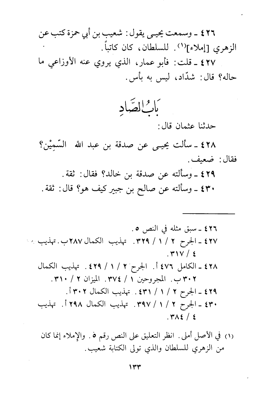 426 - وَسمعت يحيى يَقُول شُعَيْب بن أبي حَمْزَة كتب عَن الزُّهْرِيّ إملاء للسُّلْطَان كَانَ كَاتبا