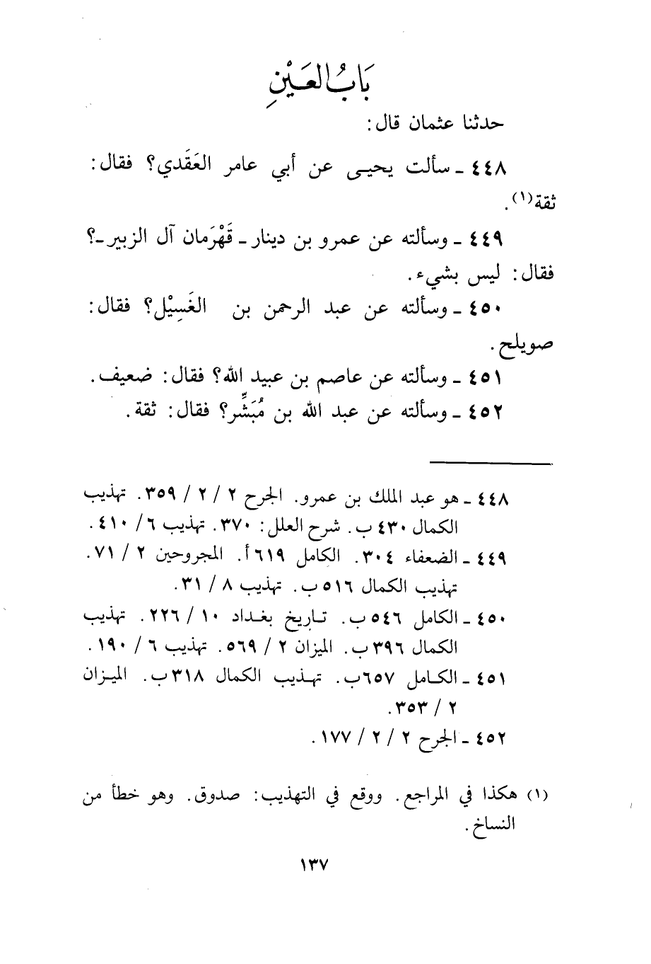 448 - سَأَلت يحيى عَن أبي عَامر الْعَقدي فَقَالَ ثِقَة