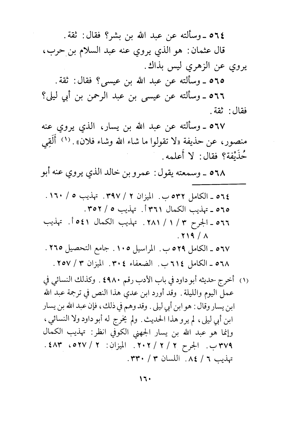 564 - وَسَأَلته عَن عبد الله بن بشر فَقَالَ ثِقَة قَالَ عُثْمَان هُوَ الَّذِي يروي عَنهُ عبد السَّلَام بن حَرْب يروي عَن الزُّهْرِيّ لَيْسَ بِذَاكَ