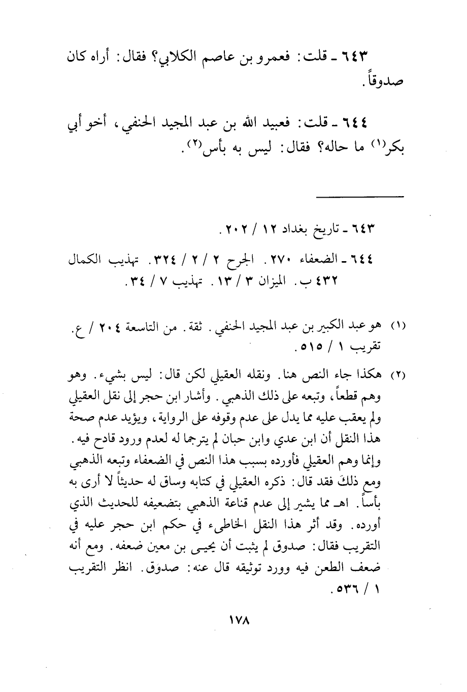644 - قلت فعبيد الله بن عبد الْمجِيد الْحَنَفِيّ أَخُو أبي بكر مَا حَاله فَقَالَ لَيْسَ بِهِ بَأْس