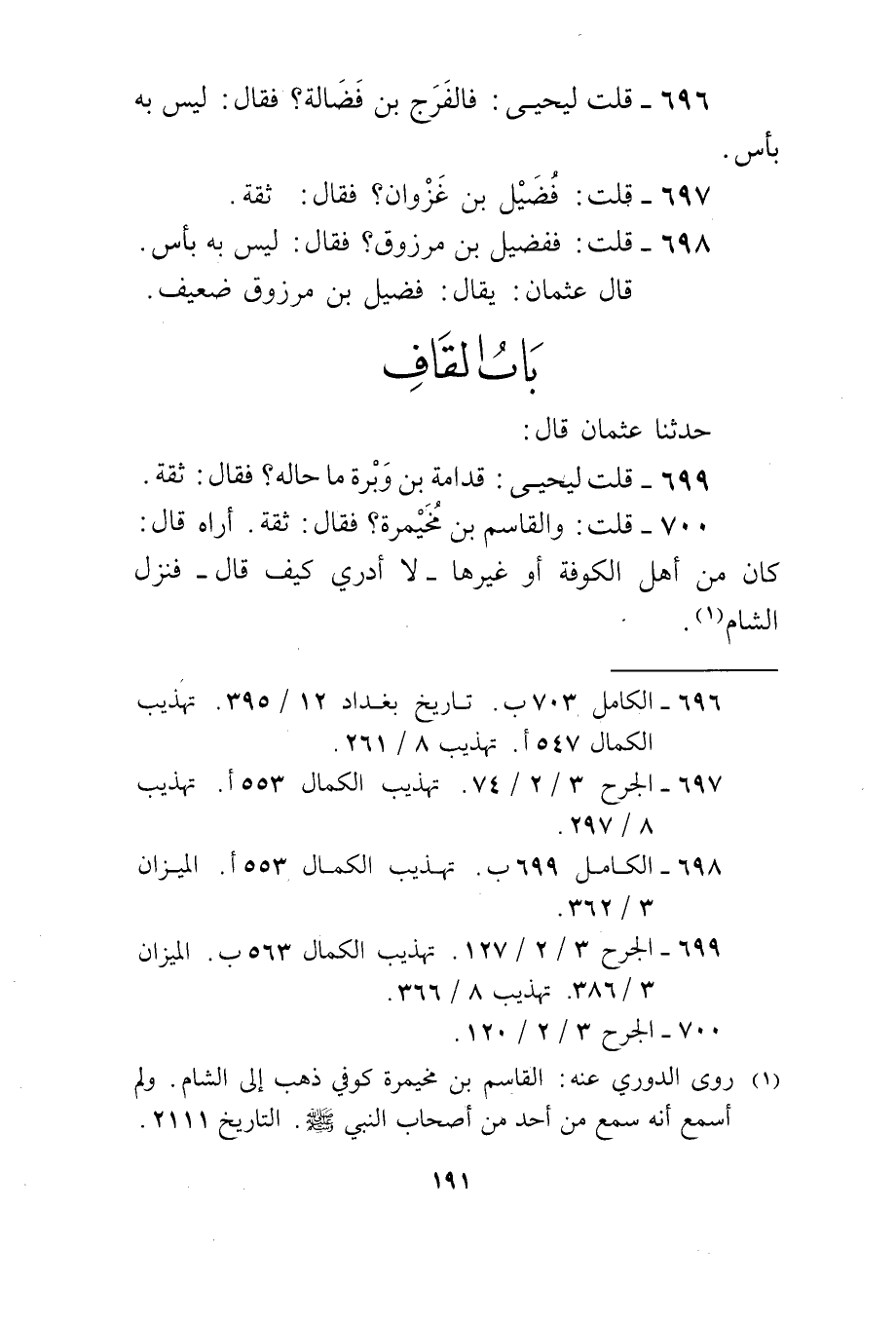 700 - قلت وَالقَاسِم بن مخيمرة فَقَالَ ثِقَة أرَاهُ قَالَ كَانَ من أهل الْكُوفَة أَو غَيرهَا لَا أَدْرِي كَيفَ قَالَ فَنزل الشَّام