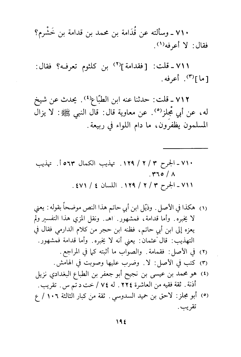 712 - قلت حَدثنَا عَنهُ بن الطباع يحدث عَن شيخ لَهُ عَن أبي مجلز عَن مُعَاوِيَة قَالَ قَالَ النَّبِي صلى الله عَلَيْهِ وَسلم لَا يزَال الْمُسلمُونَ يظفرون مَا دَامَ اللِّوَاء فِي ربيعَة فَقَالَ مَا أعرفهُ قلت وَلَا الحَدِيث قَالَ وَلَا الحَدِيث