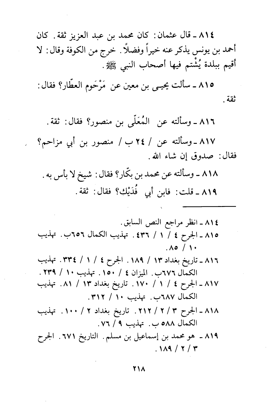 814 - قَالَ عُثْمَان كَانَ مُحَمَّد بن عبد الْعَزِيز ثِقَة كَانَ أَحْمد بن يُونُس يذكر عَنهُ خيرا وفضلا خرج من الْكُوفَة وَقَالَ لَا أقيم ببلدة يشْتم فِيهَا أَصْحَاب النَّبِي صلى الله عَلَيْهِ وَسلم