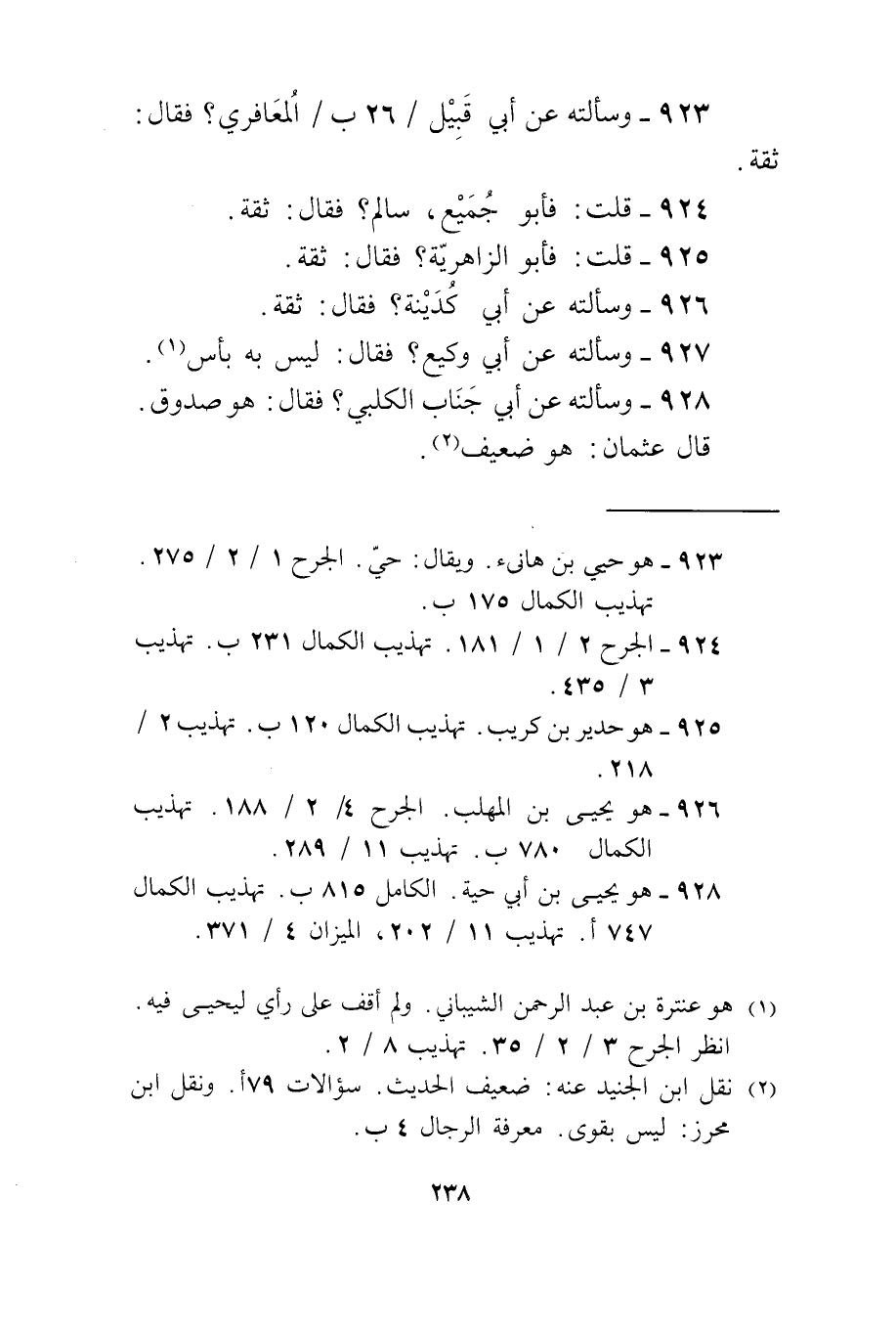 928 - وَسَأَلته عَن أبي جناب الْكَلْبِيّ فَقَالَ هُوَ صَدُوق قَالَ عُثْمَان هُوَ ضَعِيف