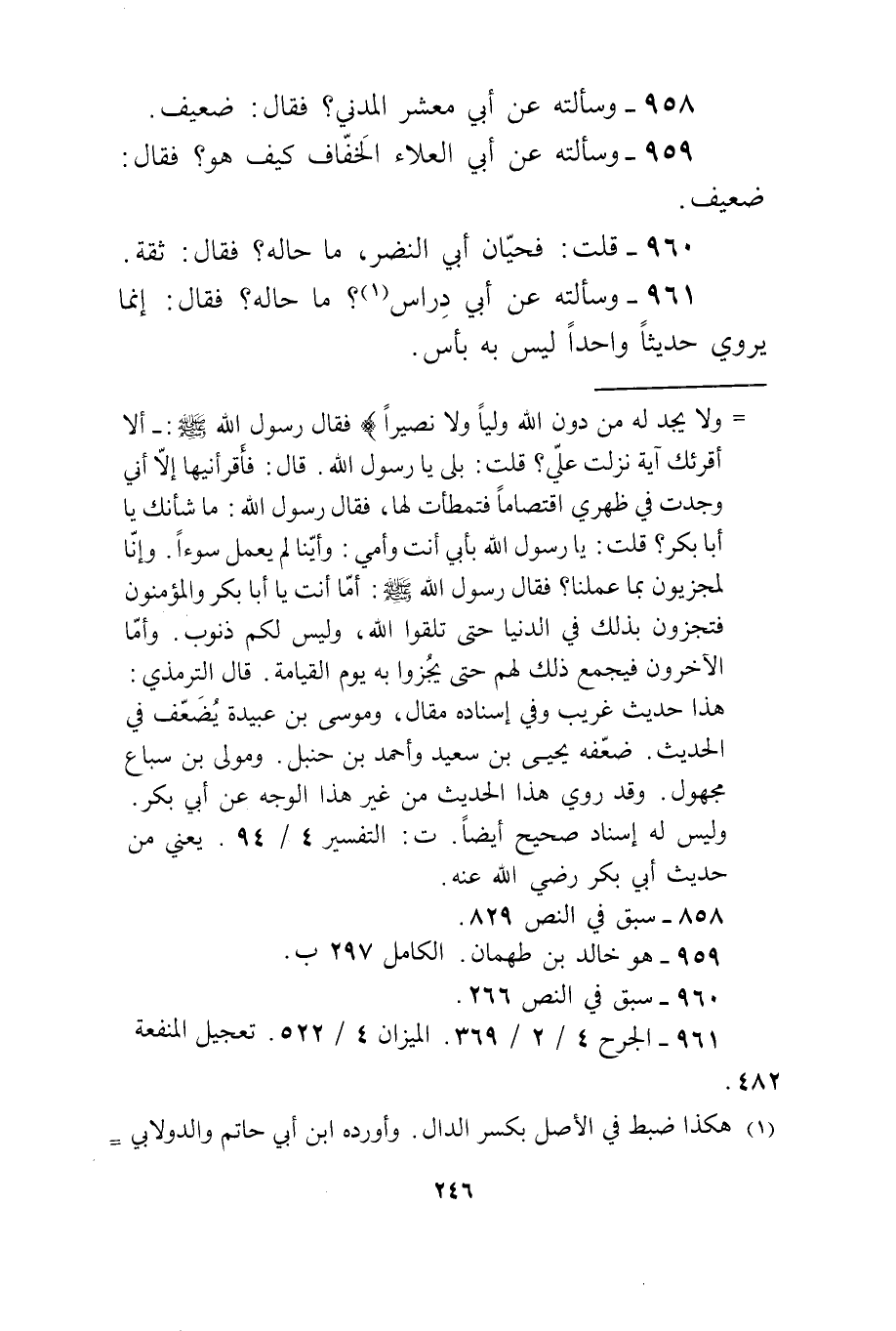 961 - وَسَأَلته عَن أبي دراس مَا حَاله فَقَالَ إِنَّمَا يروي حَدِيثا وَاحِدًا لَيْسَ بِهِ بَأْس