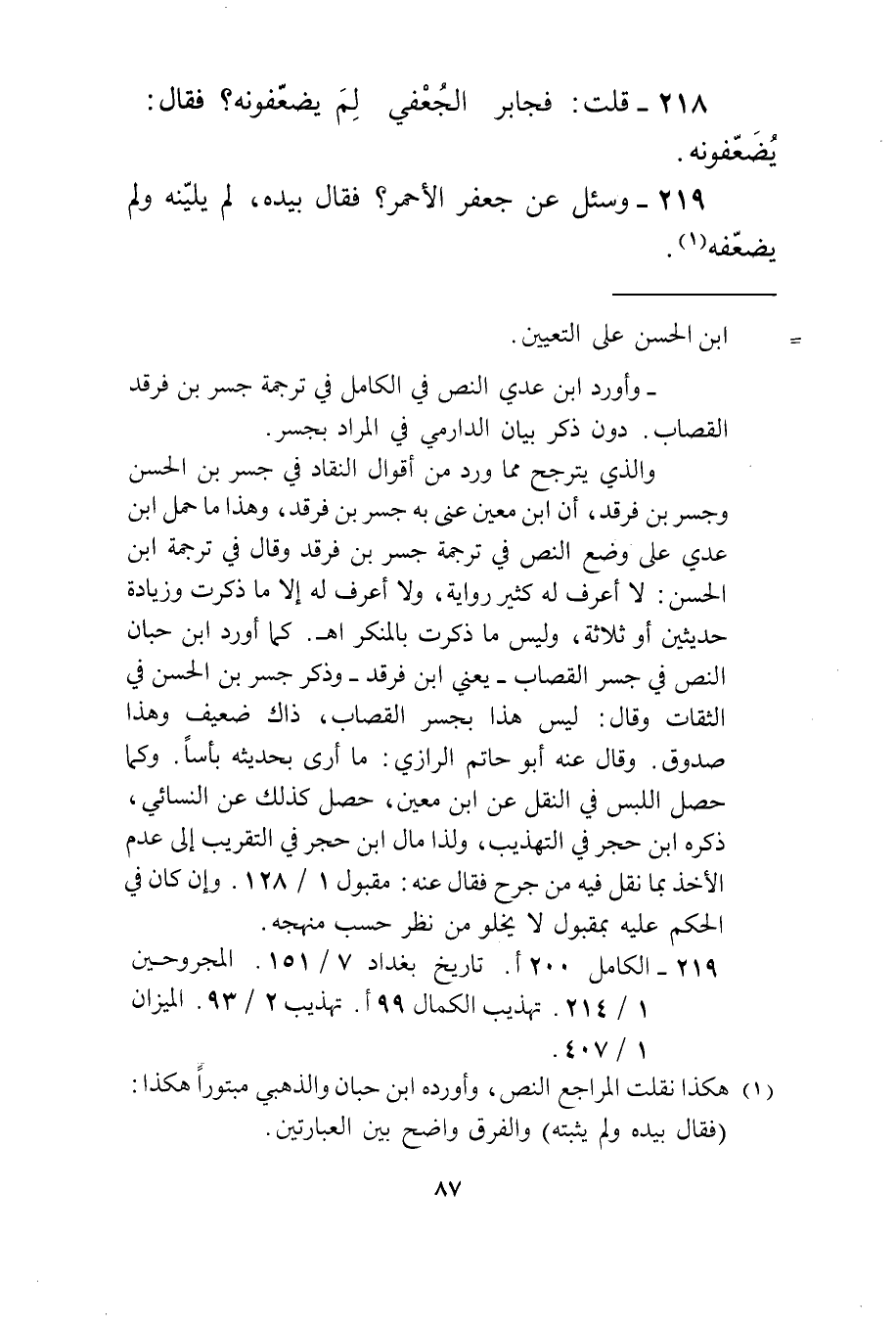 219 - وَسُئِلَ عَن جَعْفَر الْأَحْمَر فَقَالَ بِيَدِهِ لم يلينه وَلم يُضعفهُ