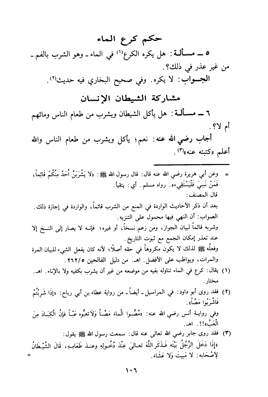 6 - مسألة: هل يأكل الشيطان ويشرب من طعام الناس ومائهم اُم لا؟.