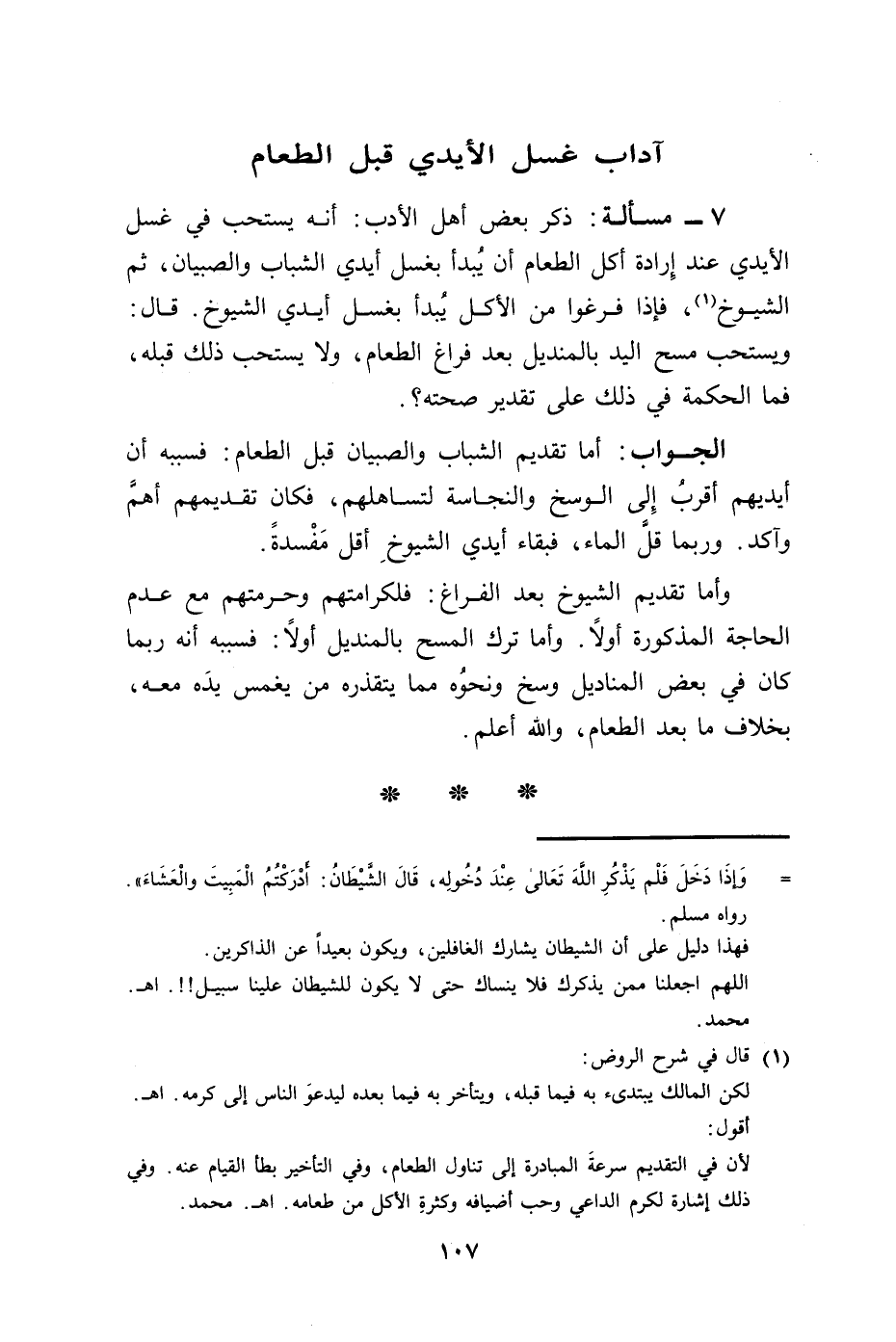 7 - مسألة: ذكر بعض أهل الأدب: أنه يستحب في غسل الأيدي عند إِرادة أكل الطعام أن يُبدأ بغسل أيدي الشباب والصبيان، ثم الشيوخ (¬1)، فإذا فرغوا من الأكل يُبدأ بغسل أيدي الشيوخ. قال: ويستحب مسح اليد بالمنديل بعد فراغ الطعام، ولا يستحب ذلك قبله، فما الحكمة في ذلك على تقدير صحته؟.