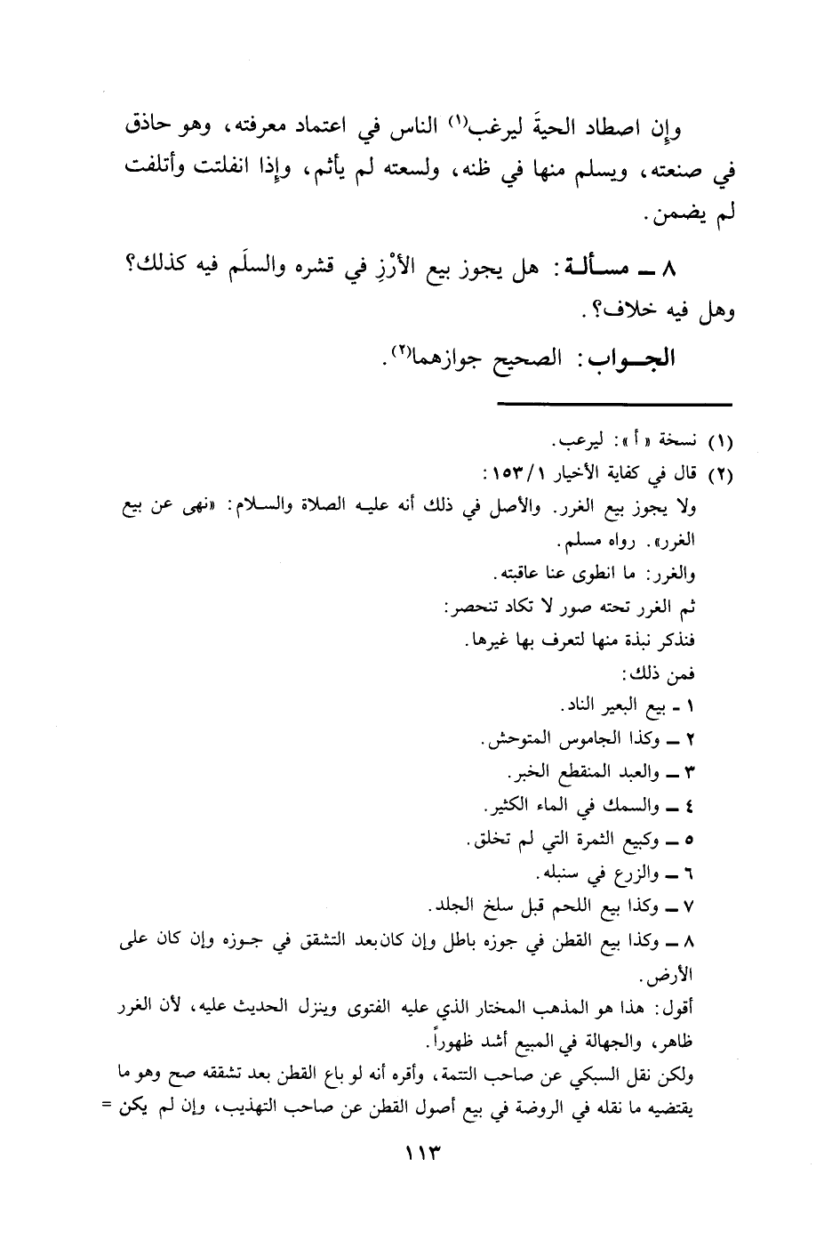 (¬2) قال في كفاية الأخيار 1/ 153: ولا يجوز بيع الغرر. والأصل في ذلك أنه عليه الصلاة والسلام: "نهى عن بيع الغرر". رواه مسلم.