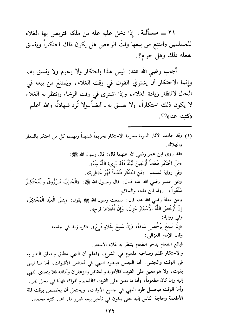 21 - مسألة: إِذا دخل عليه غلة من ملكه فتربص بها الغلاء للمسلمين وامتنع من بيعها وقتَ الرخص هل يكون ذلك احتكارًا ويفسق بفعله ذلك وهل حرام؟.
