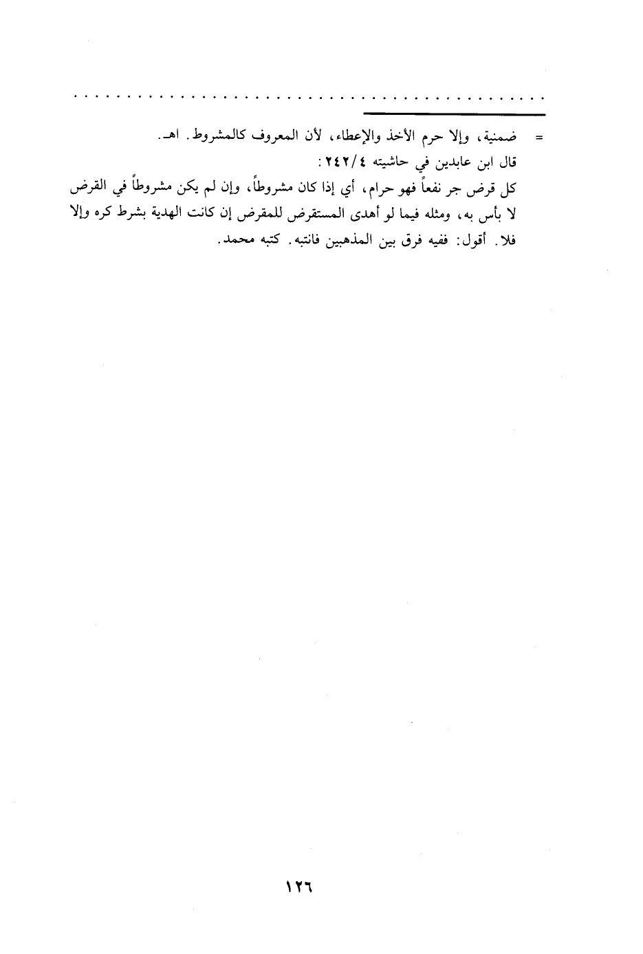 كل قرض جر نفعًا فهو حرام، أي إذا كان مشروطًا، وإن لم يكن مشروطًا في القرض لا بأس به، ومثله فيما لو أهدى المستقرض للمقرض إن كانت الهدية بشرط كره وإلا فلا. أقول: ففيه فرق بين المذهبين فانتبه. كتبه محمد.