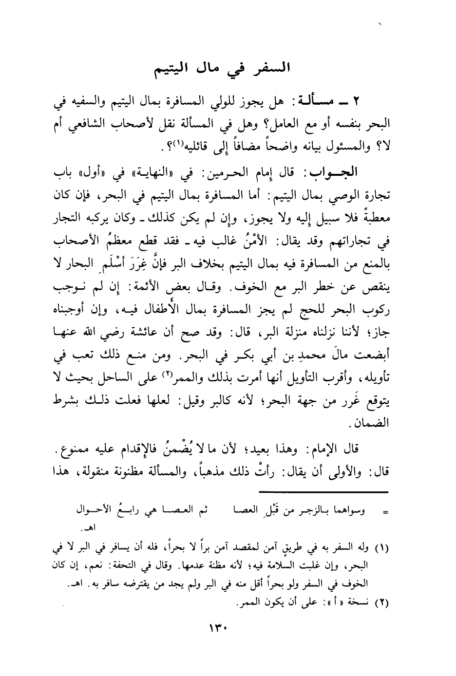 2 - مسألة: هل يجوز للولي المسافرة بمال اليتيم والسفيه في البحر بنفسه أو مع العامل؟ وهل في المسألة نقل لأصحاب الشافعي أم لا؟ والمسئول بيانه واضحًا مضافًا إِلى قائليه (¬1)؟.
