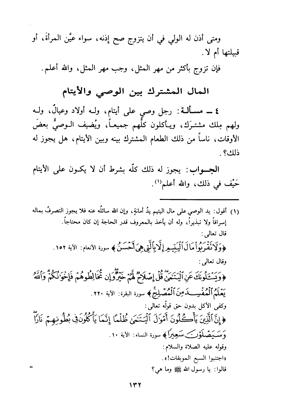 4 - مسألة: رجل وصي على أيتام، وله أولاد وعيالٌ، وله ولهم مِلك مشترَك، ويأكلون كلَّهم جميعًا، ويُضيف الوصيُّ بعضَ الأوقات، ناسًا من ذلك الطعام المشترك بينه وبين الأيتام، هل يجوز له ذلك؟.