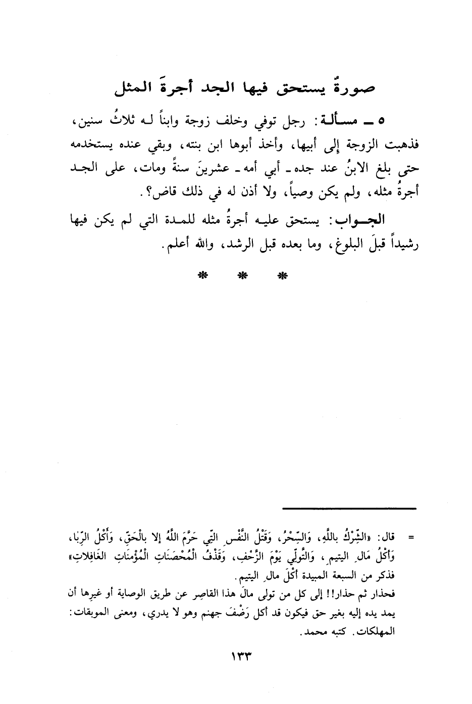 5 - مسألة: رجل توفي وخلف زوجة وابنًا له ثلاثُ سنين، فذهبت الزوجة إِلى أبيها، وأخذ أبوها ابن بنته، وبقي عنده يستخدمه حتى بلغ الابنُ عند جده -أبي أمه- عشرينَ سنةً ومات، على الجد أجرةُ مثله، ولم يكن وصيًا، ولا أذن له في ذلك قاض؟.