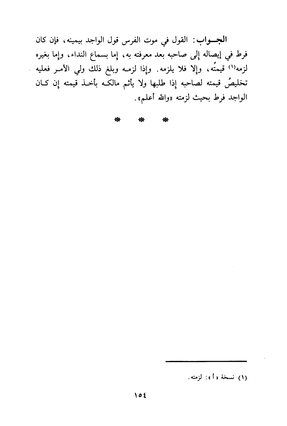 الجواب: القول في موت الفرس قول الواجد بيمينه، فإن كان فرط في إيصاله إِلى صاحبه بعد معرفته به، إما بسماع النداء، وإما بغيره لزمه (¬1) قيمتُه، وإِلا فلا يلزمه. وإِذا لزمه وبلغ ذلك ولي الأمر فعليه تخليصُ قيمته لصاحبه إِذا طلبها ولا يأثم مالكه بأخذ قيمته إِن كان الواجد فرط بحيث لزمته "والله أعلم".