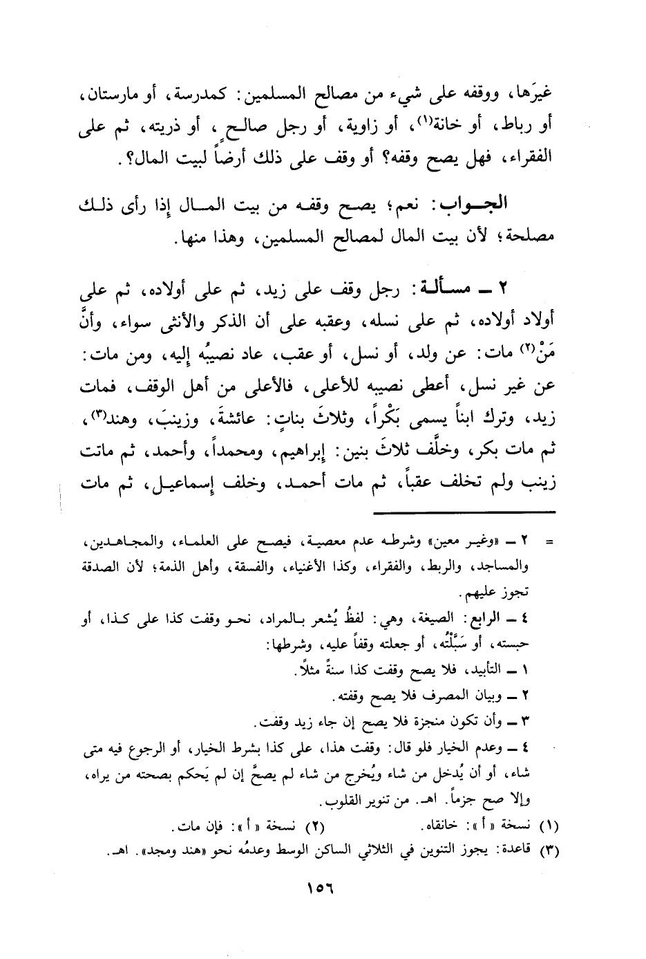 2 - مسألة: رجل وقف على زيد، ثم على أولاده، ثم على أولاد أولاده، ثم على نسله، وعقبه على أن الذكر والأنثى سواء، وأنَّ مَنْ (¬2) مات: عن ولد، أو نسل، أو عقب، عاد نصيبُه إِليه، ومن مات: عن غير نسل، أعطى نصيبه للأعلى، فالأعلى من أهل الوقف، فمات زيد، وترك ابنًا يسمى بَكْرًا، وثلاثَ بناتٍ: عائشةَ، وزينبَ، وهند (¬3)، ثم مات بكر، وخلَّف ثلاثَ بنين: إِبراهيم، ومحمدًا، وأحمد، ثم ماتت زينب ولم تخلف عقبًا، ثم مات أحمد، وخلف إِسماعيل، ثم مات