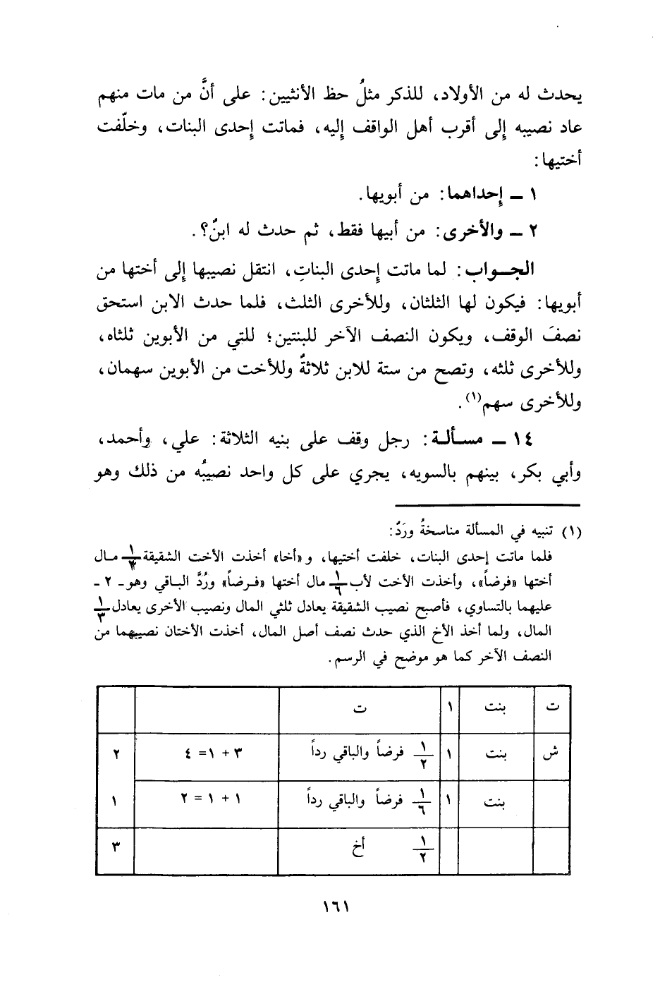 14 - مسألة: رجل وقف على بنيه الثلاثة: علي،. وأحمد، وأبي بكر، بينهم بالسويه، يجري على كل واحد نصيبُه من ذلك وهو