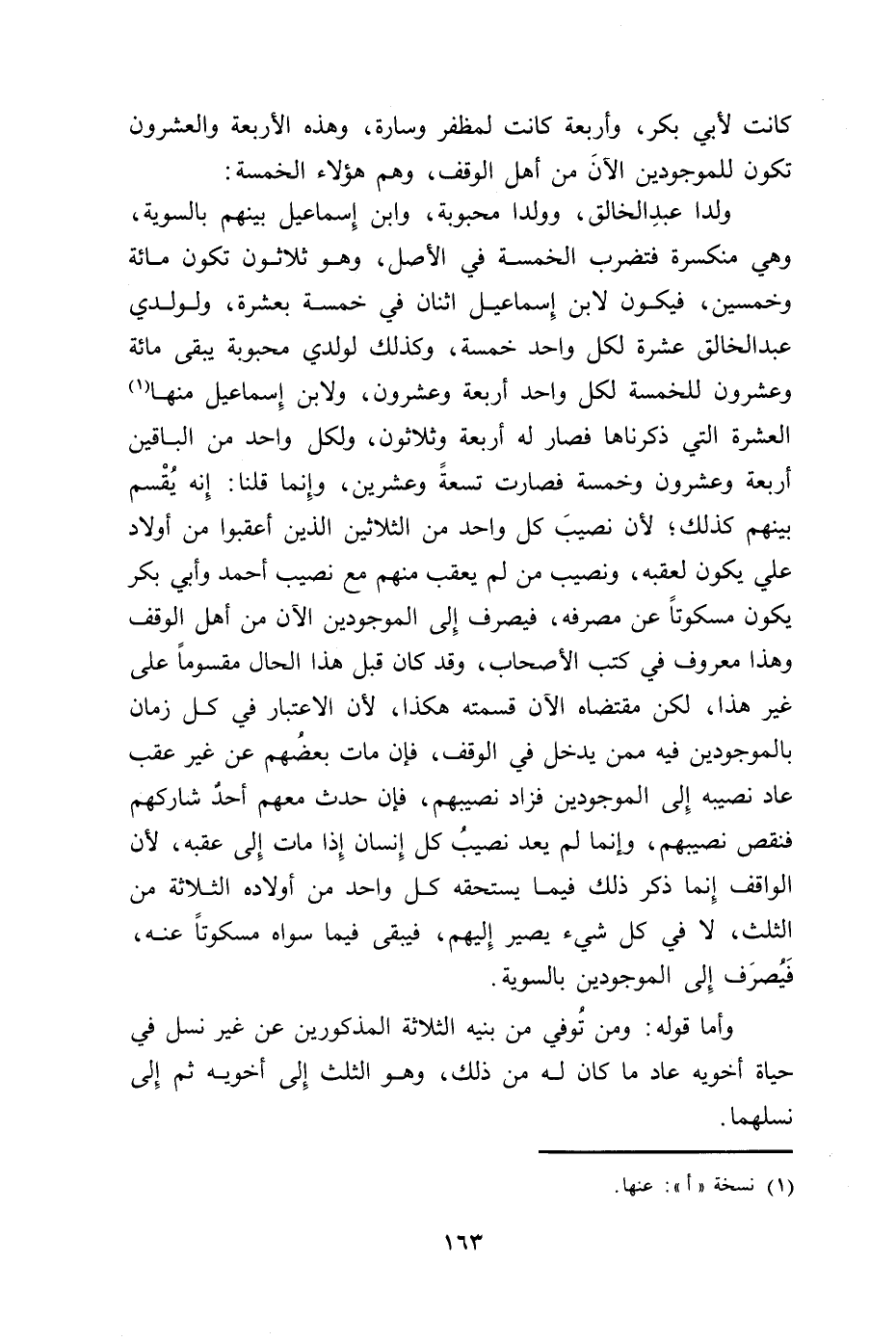 ولدا عبدِالخالق، وولدا محبوبة، وابن إِسماعيل بينهم بالسوية، وهي منكسرة فتضرب الخمسة في الأصل، وهو ثلاثون تكون مائة وخمسين، فيكون لابن إِسماعيل اثنان في خمسة بعشرة، ولولدي عبد الخالق عشرة لكل واحد خمسة، وكذلك لولدي محبوبة يبقى مائة وعشرون للخمسة لكل واحد أربعة وعشرون، ولابن إِسماعيل منها (¬1) العشرة التي ذكرناها فصار له أربعة وثلاثون، ولكل واحد من الباقين أربعة وعشرون وخمسة فصارت تسعةً وعشرين، وإِنما قلنا: إِنه يُقْسم بينهم كذلك؛ لأن نصيبَ كل واحد من الثلاثين الذين أعقبوا من أولاد علي يكون لعقبه، ونصيب من لم يعقب منهم مع نصيب أحمد وأبي بكر يكون مسكوتًا عن مصرفه، فيصرف إِلى الموجودين الآن من أهل الوقف وهذا معروف في كتب الأصحاب، وقد كان قبل هذا الحال مقسومًا على غير هذا، لكن مقتضاه الآن قسمته هكذا، لأن الاعتبار في كل زمان بالموجودين فيه ممن يدخلما في الوقف، فإن مات بعضُهم عن غير عقب عاد نصيبه إِلى الموجودين فزاد نصيبهم، فإن حدث معهم أحدٌ شاركهم فنقص نصيبهم، وإنما لم يعد نصيبُ كل إِنسان إِذا مات إِلى عقبه، لأن الواقف إِنما ذكر ذلك فيما يستحقه كل واحد من أولاده الثلاثة من الثلث، لا في كل شيء يصير إِليهم، فيبقى فيما سواه مسكوتًا عنه، فَيُصرَف إِلى الموجودين بالسوية.