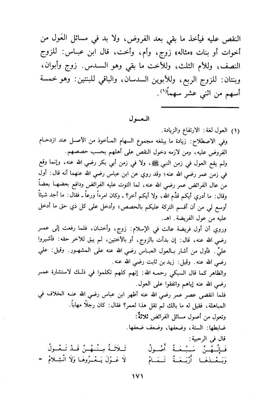 النقص عليه فيأخذ ما بقي بعد الفروض، ولا بد في مسائل العَول من أخوات أو بنات "مثاله" زوج، وأم، وأخت، قال ابن عباس: للزوج النصف، وللأم الثلث، وللأخت ما بقي وهو السدس. زوج وأبوان، وبنتان: للزوج الربع، وللأبوين السدسان، والباقي للبنتين: وهو خمسة أسهم من اثني عشر سهمًا (¬1).