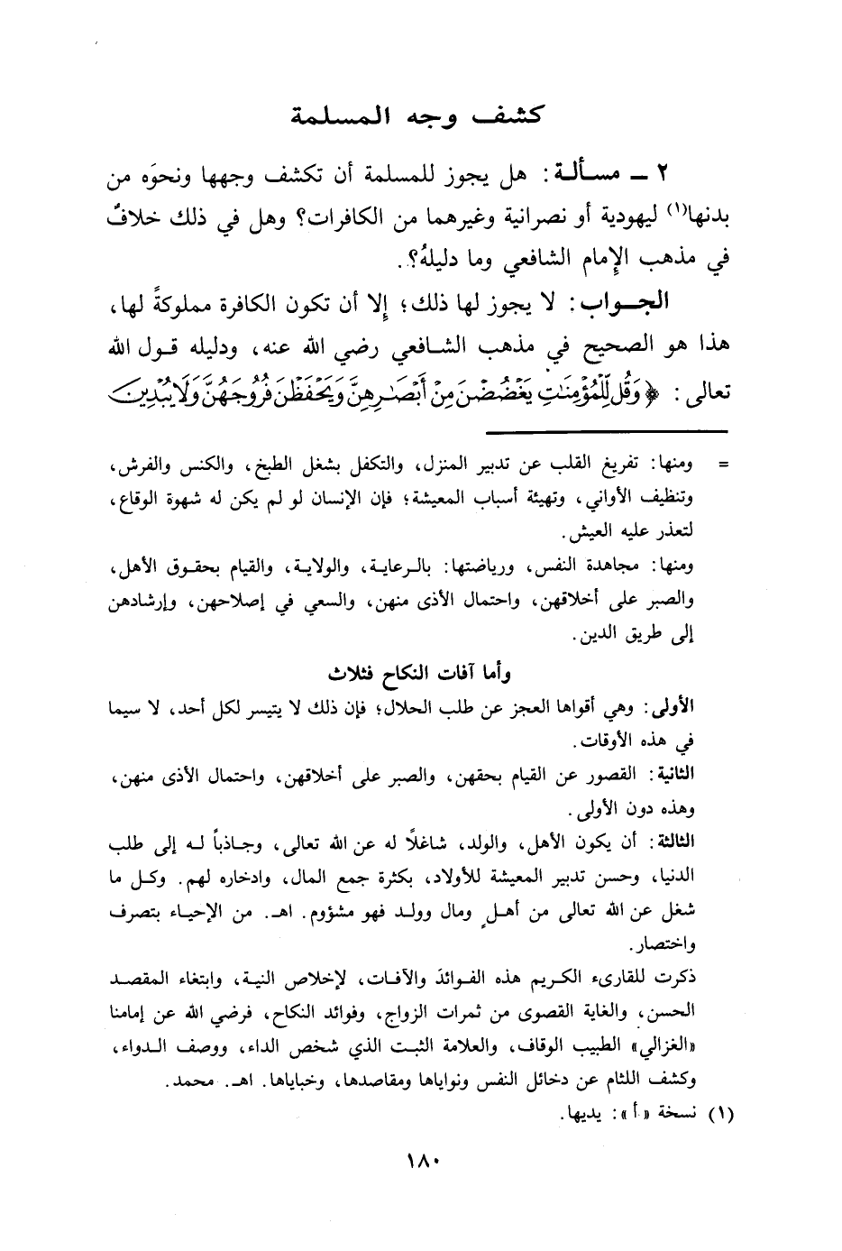 2 - مسألة: هل يجوز للمسلمة أن تكشف وجهها ونحوَه من بدنها (¬1) ليهودية أو نصرانية وغيرهما من الكافرات؟ وهل في ذلك خلافٌ في مذهب الِإمام الشافعي وما دليلهُ؟.