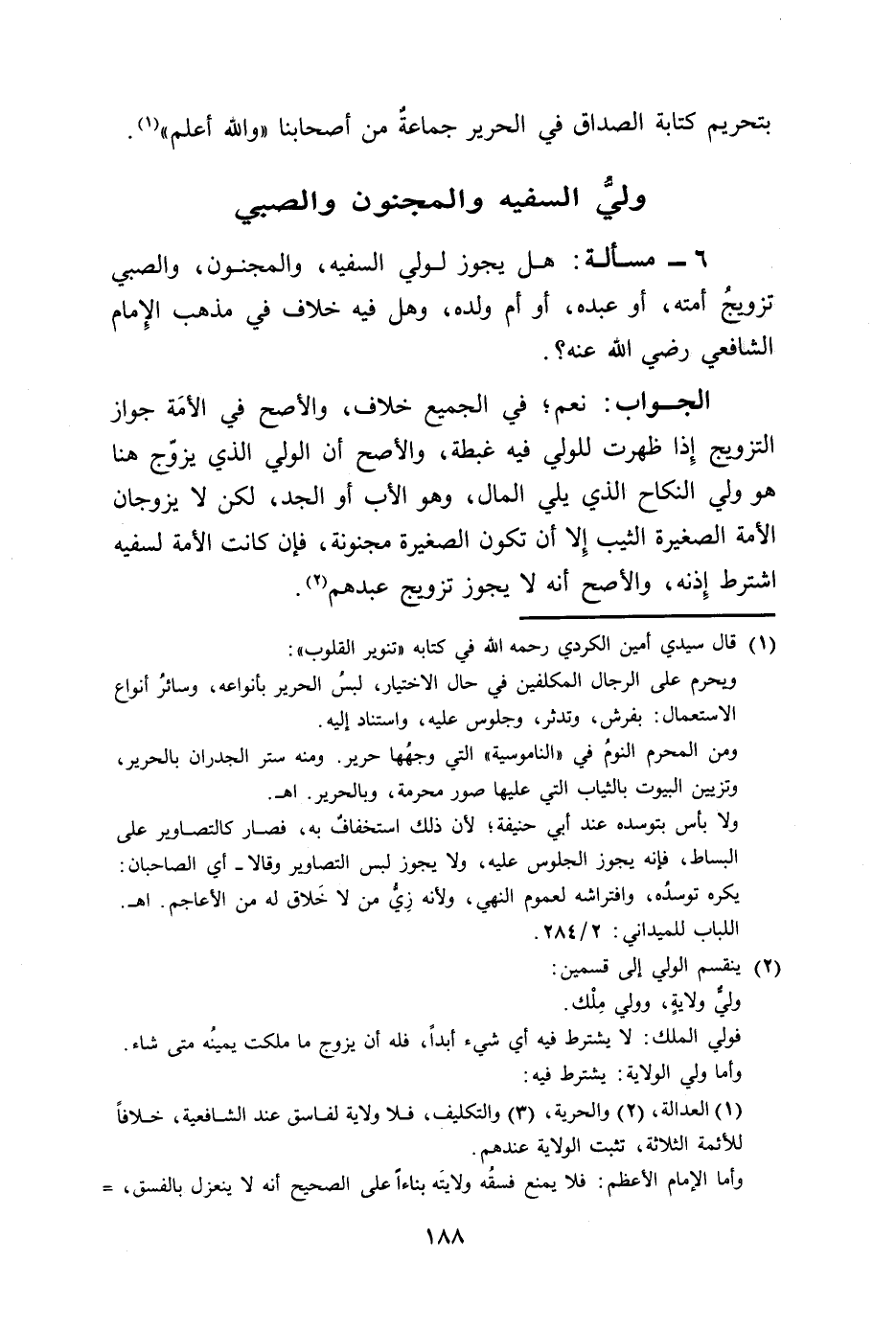 6 - مسألة: هل يجوز لولي السفيه، والمجنون، والصبي تزويجُ أمته، أو عبده، أو أم ولده، وهل فيه خلاف في مذهب الِإمام الشافعي رضي الله عنه؟.