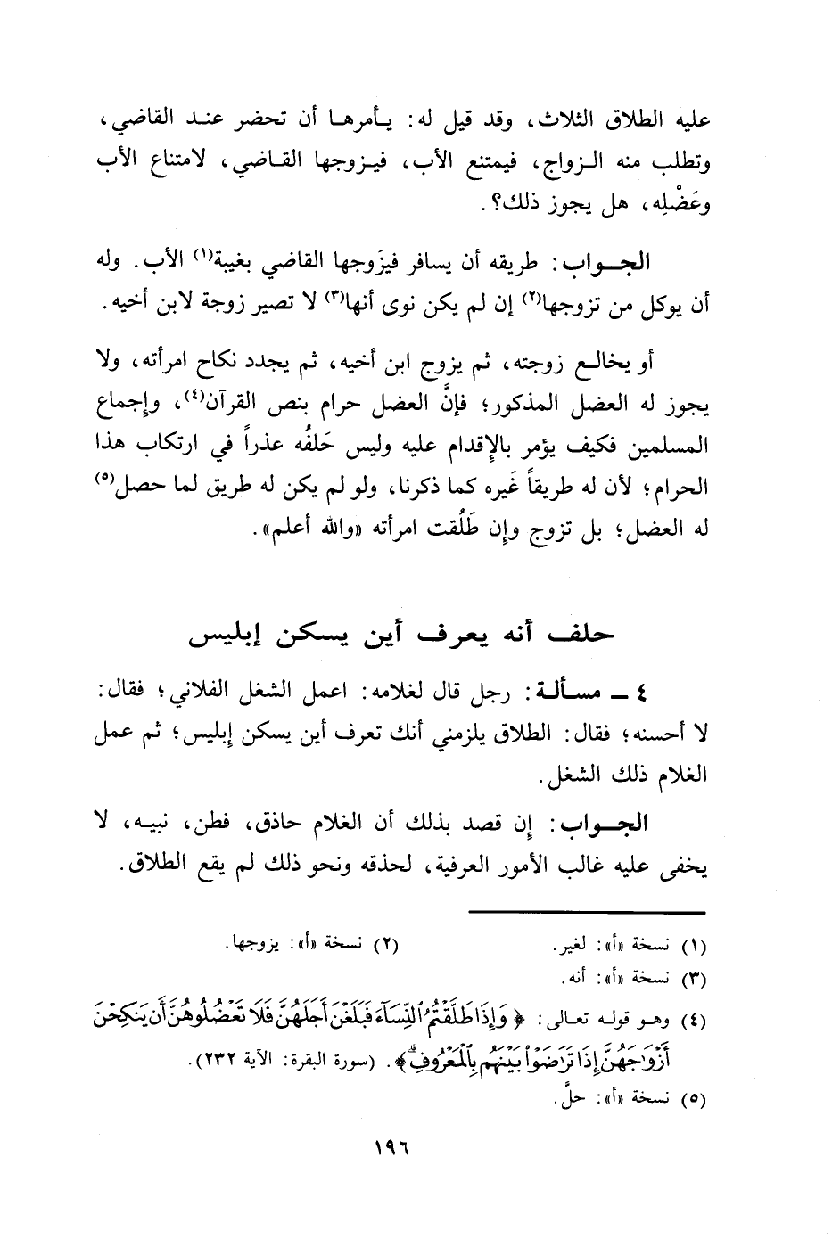 4 - مسألة: رجل قال لغلامه: اعمل الشغل الفلاني؛ فقال: لا أحسنه؛ فقال: الطلاق يلزمني أنك تعرف أين يسكن إِبليس؛ ثم عمل الغلام ذلك الشغل.