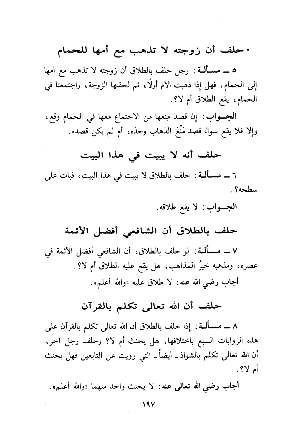 8 - مسألة: إِذا حلف بالطلاق أن الله تعالى تكلم بالقرآن على هذه الروايات السبع باختلافها، هل يحنث أم لا؟ وحلف رجل آخر، أن الله تعالى تكلم بالشواذ -أيضًا- التي رويت عن التابعين فهل يحنث أم لا؟.
