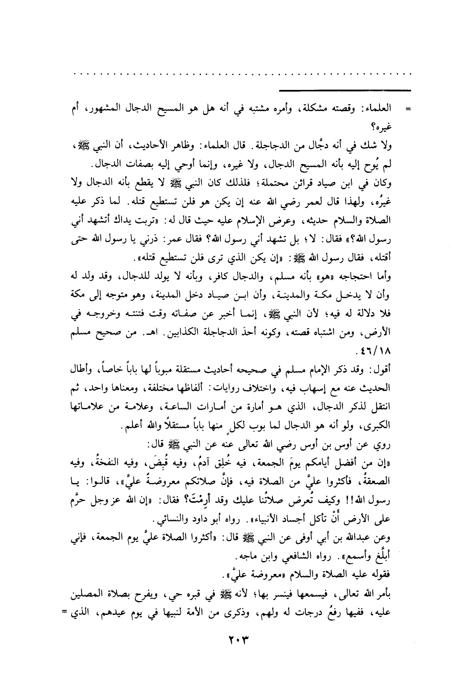 وأما احتجاجه "هو" بأنه مسلم، والدجال كافر، وبأنه لا يولد للدجال، وقد ولد له وأن لا يدخل مكة والمدينة، وأن ابن صياد دخل المدينة، وهو متوجه إلى مكة فلا دلالة له فيه؛ لأن النبي - صلى الله عليه وسلم -، إنما أخبر عن صفاته وقت فتنته وخروجه في الأرض، ومن اشتباه قصته، وكونه أحدَ الدجاجلة الكذابين. اهـ. من صحيح مسلم 18/ 46.