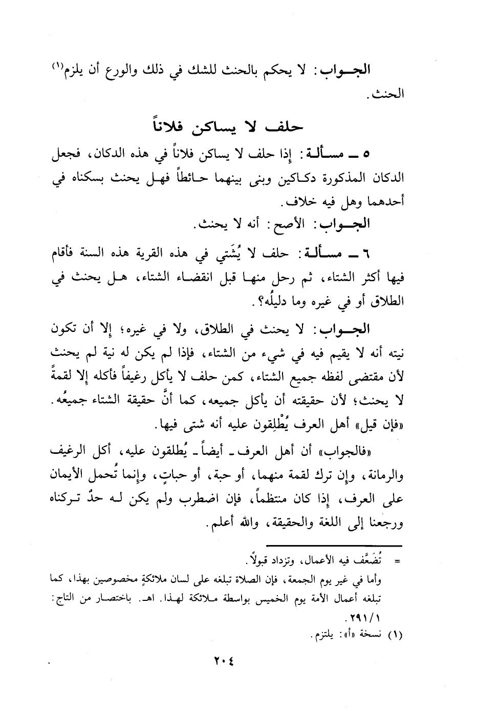 الجواب: لا يحكم بالحنث للشك في ذلك والورع أن يلزم (¬1) الحنث.
