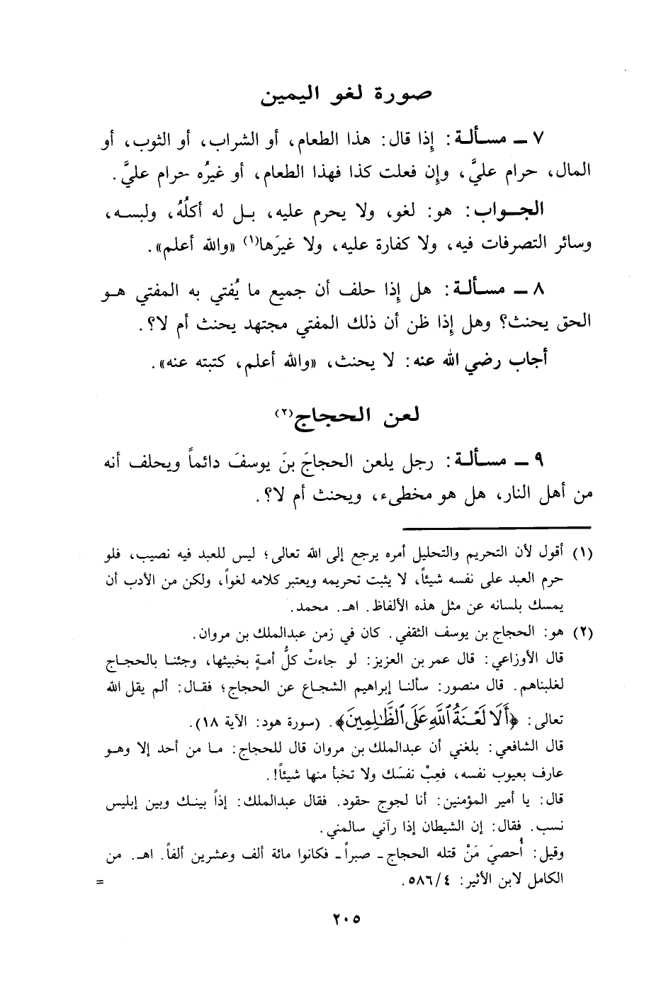 9 - مسألة: رجل يلعن الحجاجَ بنَ يوسفَ دائمًا ويحلف أنه من أهل النار، هل هو مخطىء، ويحنث أم لا؟.