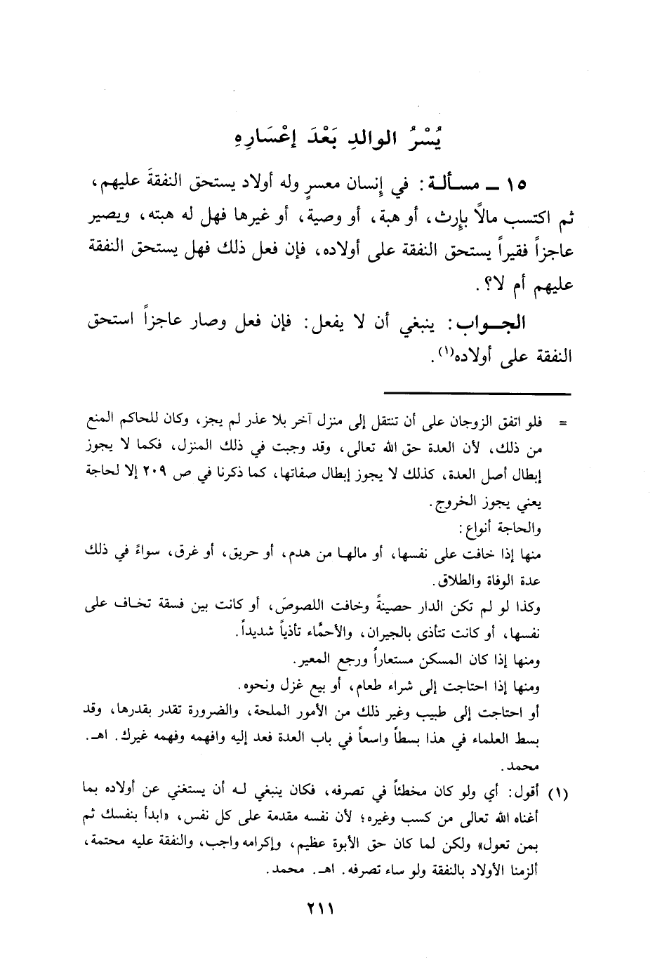(¬1) أقول: أي ولو كان مخطئًا في تصرفه، فكان ينبغي له أن يستغني عن أولاده بما أغناه الله تعالى من كسب وغيره؛ لأن نفسه مقدمة على كل نفس، "ابدأ بنفسك ثم بمن تعول، ولكن لما كان حق الأبوة عظيم، وإكرامه واجب، والنفقة عليه محتمة، ألزمنا الأولاد بالنفقة ولو ساء تصرفه. اهـ. محمد.
