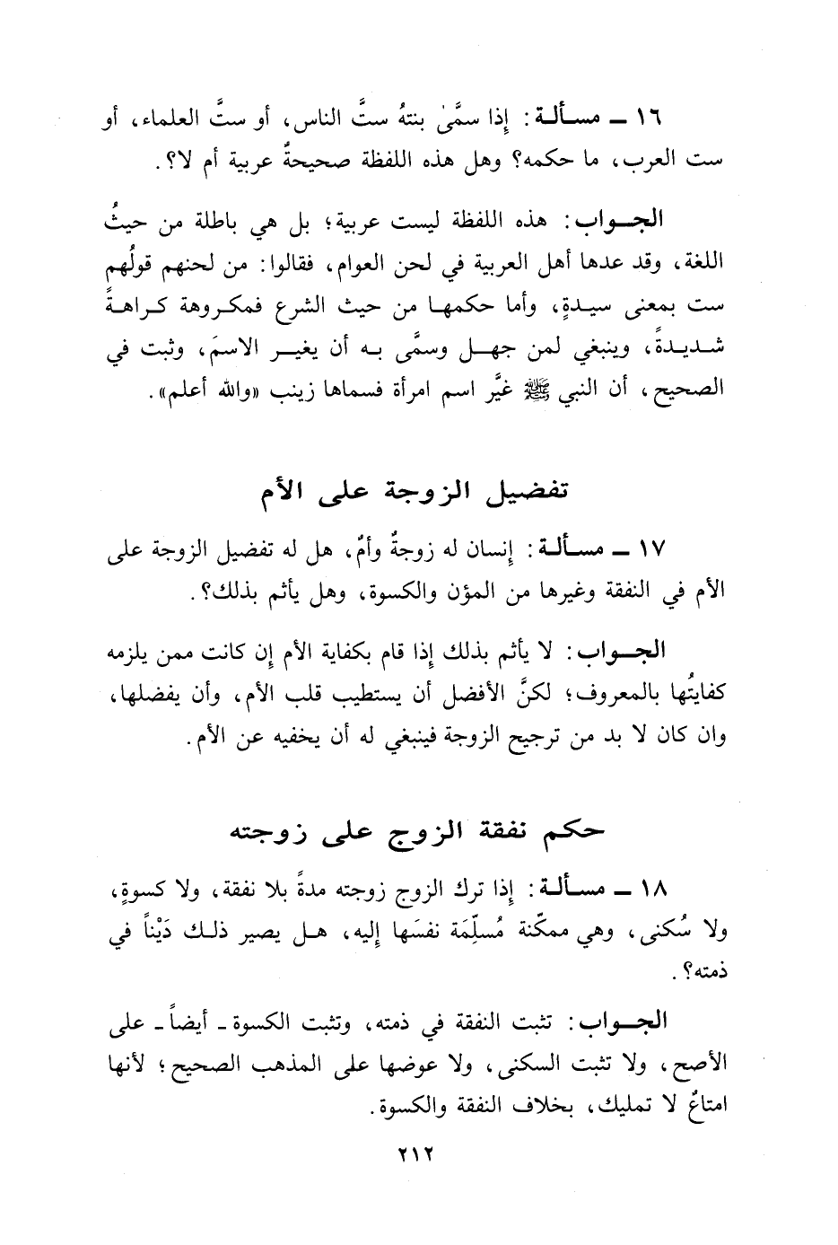 17 - مسألة: إِنسان له زوجةٌ وأمٌ، هل له تفضيل الزوجة على الأم في النفقة وغيرها من المؤن والكسوة، وهل يأثم بذلك؟.
