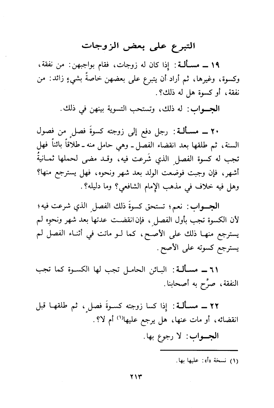 20 - مسألة: رجل دفع إلى زوجته كسوةَ فصلٍ من فصول السنة، ثم طلقها بعد انقضاء الفصل -وهي حامل منه- طلاقًا بائنًا فهل تجب له كسوة الفصلِ الذي شَرعت فيه، وقد مضى لحملها ثمانية أشهر، فإن وجبت فوضعت الولد بعد شهر ونحوه، فهل يسترجع منها؟ وهل فيه خلاف في مذهب الِإمام الشافعي؟ وما دليله؟.