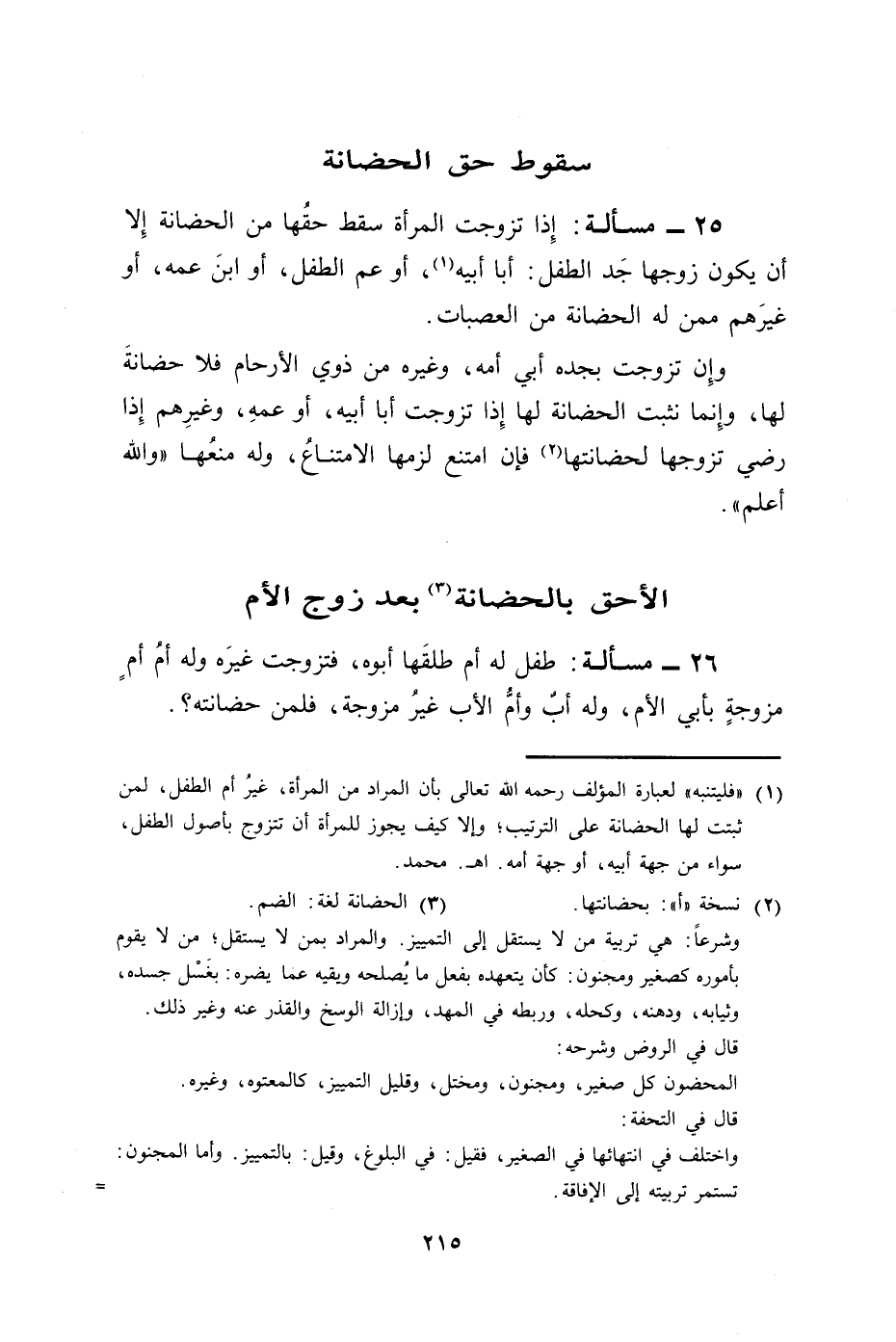 25 - مسألة: إِذا تزوجت المرأة سقط حقُها من الحضانة إِلا أن يكون زوجها جَد الطفل: أبا أبيه (¬1)، أو عم الطفل، أو ابنَ عمه، أو غيرَهم ممن له الحضانة من العصبات.