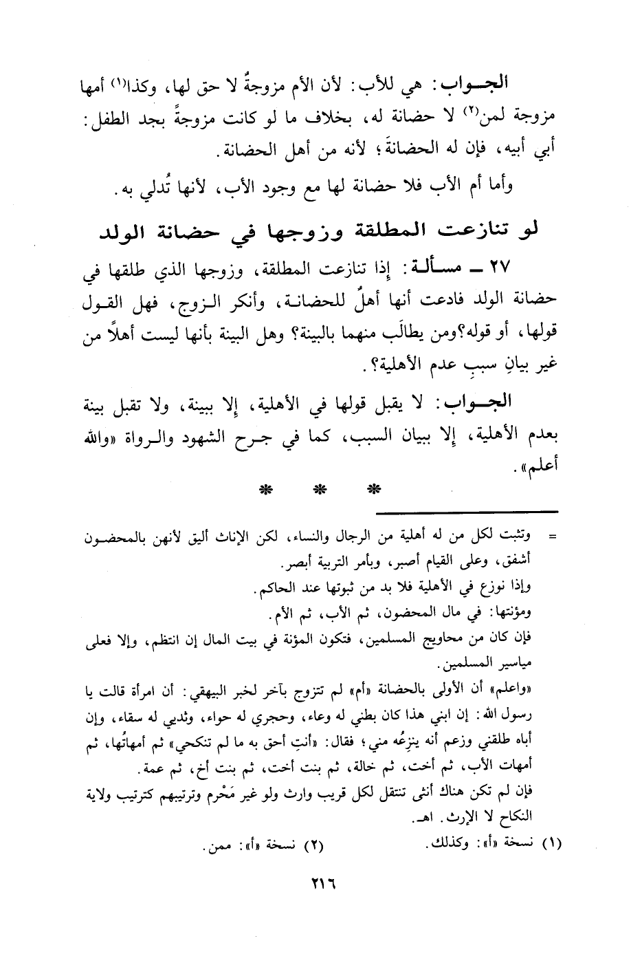 27 - مسألة: إِذا تنازعت المطلقة، وزوجها الذي طلقها في حضانة الولد فادعت أنها أهلٌ للحضانة، وأنكر الزوج، فهل القول قولها، أو قوله؟ ومن يطالَب منهما بالبينة؟ وهل البينة بأنها ليست أهلًا من غير بيانِ سببِ عدم الأهلية؟.