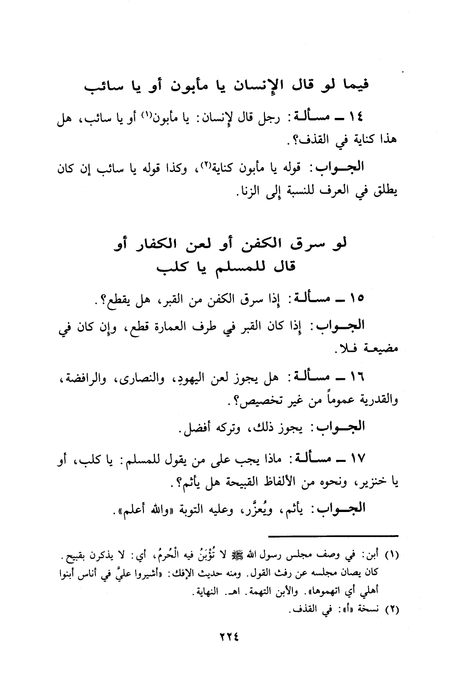 17 - مسألة: ماذا يجب على من يقول للمسلم: يا كلب، أو يا خنزير، ونحوه من الألفاظ القبيحة هل يأثم؟.