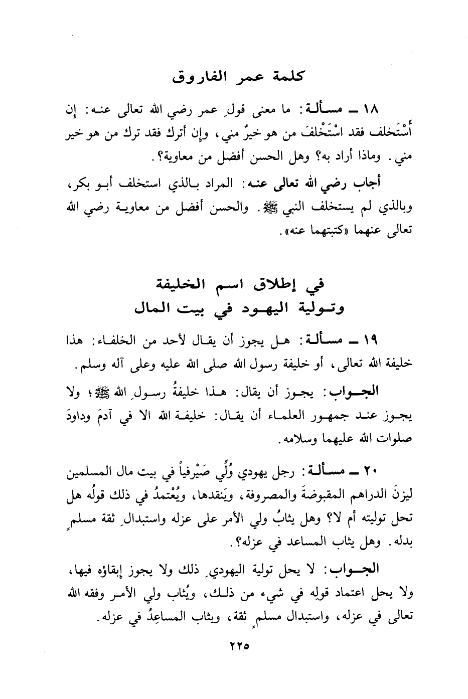 19 - مسألة: هل يجوز أن يقال لأحد من الخلفاء: هذا خليفة الله تعالى، أو خليفة رسول الله صلى الله عليه وعلى آله وسلم.