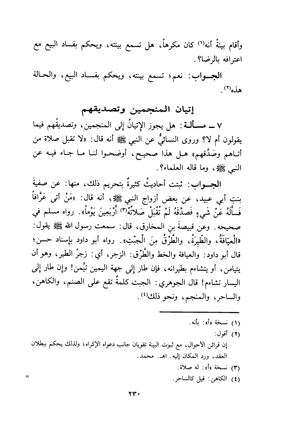 7 - مسألة: هل يجوز الِإتيانُ إِلى المنجمين، وتصديقُهم فيما يقولون أم لا؟ وروى النسائي عن النبي - صلى الله عليه وسلم - أنه قال: "لا تقبل صلاة من أتاهم وصَدَّقهم" هل هذا صحيح، أوضحوا لنا ما جاء فيه عن النبي - صلى الله عليه وسلم -، وما قاله العلماء؟.